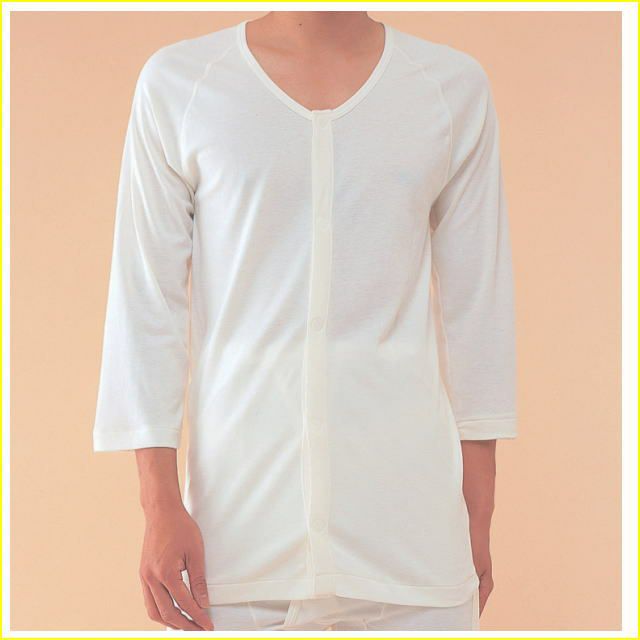 ◎ワンタッチ肌着◎--ボタンをかける手間を全面解消した、丸型マジック式ボタン肌着。[肌へのやさしさ] 品質の基本は素材にこだわること。高級エジプト綿60単糸を使った 両面編立生地の使用によって、吸汗性、保湿性、肌ざわりのよさを実現させました。 [着心地のよさ] いつまでも快適な着心地が長続き。その理由は前立や脇開きに採用した 共生地使いや、抜群の伸縮性を生む、独自の縫製技術にあります。下記の縫い目の図のように、一般的な縫い目が盛り上がる方法では無く、平になるように縫製しています。(フラットシーマーミシンを使用)当商品をはじめ、当社品番No.で始まるワンタッチ肌着に採用しています。療養者に無理をさせません。腕が通しやすいラグラン袖。丸型マジック付。ボタンをかける手間を全面解消。テープを丸形にカットするなど、デザイン面も配慮しました。●素材/綿100% ●品質/60単糸両面編み(高級綿) ●日本製 (兵庫県製) ●肌にやさしい無蛍光生地を使用 ・蛍光剤は一切使用していません。 生地・縫製糸・ケアラベルにいたるまで、無蛍光素材を使用しています●洗濯機可(弱)●脱水機可●乾燥機不可