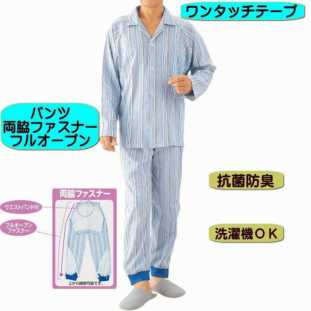 【前合わせ+飾りボタン】見た目は普通のパジャマですが、ワンタッチテープ仕様で着替えや 検温時の開閉が簡単です【袖口】点滴や検温に便利なオープンタイプです。【フルオープンファスナー】上から開閉できるフルオープンファスナーです。 おむつ交換や着替えがラクにできます。【ウエストバンド付】ウエストバンド付なので、立ったまま おむつやパッド交換をしてもズレません。裾はパンツがめくり上がりにくいリブ仕様です。◎ストライプ柄は若干変更になる場合もございます。