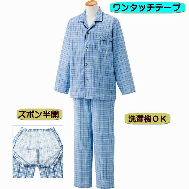 ワンタッチ+腰開きパジャマおむつ交換などに便利な腰開きパンツのパジャマです見た目は普通のパジャマですが、前合わせ、袖口、裾口もワンタッチテープなので、着替えや検温、点滴時簡単に開閉できます。また腰開きタイプなのでおむつの交換や着替えなどがラクに行えます。介護用パジャマワンタッチテープ前合わせ、袖口、裾口、ウエストにそれぞれワンタッチテープを使っているので着せ替えがスムーズです。※格子柄は若干変更になる場合もございます。 ●品名/ワンタッチテープ+腰開きキルトパジャマ●色/ブルー・グレー●サイズ/M/L●材質/ポリエステル85% 綿15% ニットキルト●追加説明/左胸ポケット付き●生産国/中国製●仕様/テープ説明(前合わせ・袖口・ウェスト・裾口部分ワンタッチテープ仕様で着せ替えがスムースです)洗濯機OK 秋冬用●説明/保温性の高いキルト素材。