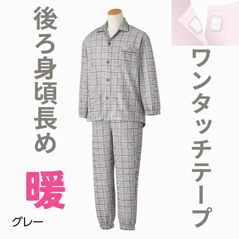 快適な日常生活をお過ごしいただけるためにお役立ていただける商品です着やすさとやさしい工夫のアイテムです後ろ身頃が長く腰が冷えにくいパジャマ秋冬に最適な保温性のよいキルト素材キルト素材で温かくなった空気を逃さず保温性抜群着脱カンタン!様々な工夫【ワンタッチテープ】ボタンが留めにくい方は前合わせのワンタッチテープ仕様で、着替えがスムーズにワンタッチ肌着で前が開くので着脱が楽です開け閉めがさっとできるから着替えがラクラク!着やすく脱ぎやすい親切設計!前開きなので一人でも簡単につけることができます【手口・足口ゴム入り】手口と足口にゴム入りなので、めくれ上がりにくい設計です。後ろ身頃を長めにしているので、背中が曲がった方でも、背中が出にくい設計です。ウエスト調整ゴム付なのでゴムを入れ替えなくてもウエストサイズを自由自在に調整できます。名前記入欄付で間違い防止名前が書けるタグ付きなので、入院や施設入居時など、脱いだ後や洗濯後も他人のものと間違うことがありません。 マジックテープ商品に関するご注意洗濯時にはゴミのなどの付着の原因になりますのでテープを張り合わせてください。●品名/紳士ワンタッチキルトパジャマ 秋冬用●色/ブルー・グレー●サイズ/M・L●素材/ポリエステル90%・綿10%●生産国/中国製●仕様/キルト ※柄は若干変更になる場合もございます。 洗濯機OK(ネット使用) 名前記入欄付 ワンタッチテープ 後ろ身頃長め 秋冬用 手口・足口ゴム入り(取替口付) ウエスト調整ゴム付●説明/後ろ身頃が長く腰が冷えにくいパジャマ秋冬に最適な保温性のよいキルト素材キルト素材で温かくなった空気を逃さず保温性抜群