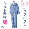 快適な日常生活をお過ごしいただけるためにお役立ていただける商品です着やすさとやさしい工夫のアイテムです暖かく空気を逃がしにくいキルト素材。秋冬に最適な保温性のよいキルト素材キルト素材で温かくなった空気を逃さず保温性抜群着脱カンタン!様々な工夫【ホックボタンパジャマ】脱ぎ着しやすい工夫を凝らした優しい設計です。ボタンが留めにくい方でも着替えに便利な前開きのホック留めです。●品名/紳士ホックキルトパジャマ 秋冬用●色/ブルー・グレー●サイズ/S・M・L・LL●素材/表ポリエステル100%、中綿ポリエステル100%、裏:ポリエステル80%・綿20%●生産国/中国製●仕様/キルト ※柄は若干変更になる場合もございます。 洗濯機OK ホック 秋冬用●説明/暖かく空気を逃がしにくいキルト素材。秋冬に最適な保温性のよいキルト素材キルト素材で温かくなった空気を逃さず保温性抜群