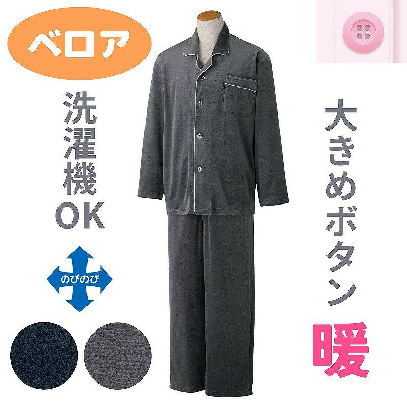 快適な日常生活をお過ごしいただけるためにお役立ていただける商品です着やすさとやさしい工夫のアイテムです毛布のような暖かな生地で冬の寒さに快適。のびのびの生地を使用しているので、体の動きを妨げません。着脱カンタン!様々な工夫脱ぎ着しやすい工夫を凝らした優しい設計です。つかみやすい大きめボタンで手の力が弱くてもボタンの留め外しがラクラクです。一般のボタンに比べてつかみやすい大きめボタンを採用。この違いがご自身での着脱も簡単にしてくれます。●品名/大きめボタンベロアパジャマ●色/ネイビー・チャコール●サイズ/M・L●素材/ポリエステル95%・ポリウレタン5%●生産国/中国製●仕様/※柄は若干変更になる場合もございます。 洗濯機OK(ネット使用) 大きめボタン のびのび●説明/毛布のような暖かな生地で冬の寒さに快適。のびのびの生地を使用しているので、体の動きを妨げません。