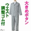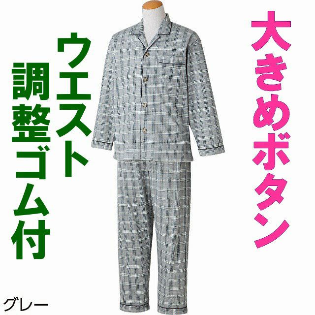 快適な日常生活をお過ごしいただけるためにお役立ていただける商品ですつかみやすい大きめボタンで手の力が弱くてもボタンの留め外しがラクラクです。一般のボタンに比べてつかみやすい大きめボタンを採用。この違いがご自身での着脱も簡単にしてくれます。1年を通して快適に着られるスムース素材●品名/大きめボタンパジャマ●色/ブルー・グレー●サイズ/S・M・L・LL●材質/ポリエステル65% 綿35% スムース●生産国/中国製●仕様・説明/※柄は若干変更になる場合もございます。 大きめボタン、ウエスト調節ゴム付き 洗濯機OK 年間素材 ●説明/1年を通して快適に着られるスムース素材。