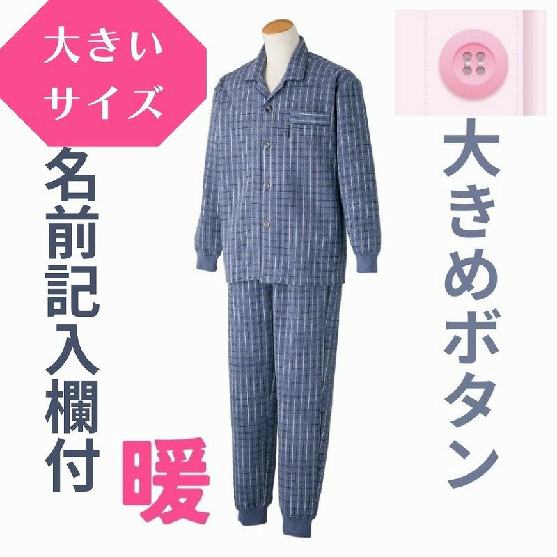 快適な日常生活をお過ごしいただけるためにお役立ていただける商品です着やすさとやさしい工夫のアイテムですM~4L の幅広いサイズ展開の大きめボタンパジャマ秋冬に最適な保温性のよいキルト素材キルト素材で温かくなった空気を逃さず保温性抜群着脱カンタン!様々な工夫脱ぎ着しやすい工夫を凝らした優しい設計です。つかみやすい大きめボタンで手の力が弱くてもボタンの留め外しがラクラクです。一般のボタンに比べてつかみやすい大きめボタンを採用。この違いがご自身での着脱も簡単にしてくれます。名前記入欄付で間違い防止名前が書けるタグ付きなので、入院や施設入居時など、脱いだ後や洗濯後も他人のものと間違うことがありません。●品名/紳士大きめボタンキルトパジャマ 秋冬用●色/ブルー・グレー●サイズ/3L・4L●素材/ポリエステル85%・綿15%●生産国/中国製●仕様/キルト ※柄は若干変更になる場合もございます。 洗濯機OK 名前記入欄付 大きめボタン 秋冬用 リブ付き M~4L●説明/M~4L の幅広いサイズ展開の大きめボタンパジャマ秋冬に最適な保温性のよいキルト素材キルト素材で温かくなった空気を逃さず保温性抜群