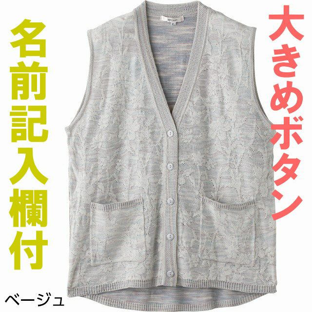 快適な日常生活をお過ごしいただけるためにお役立ていただける商品です【快適ニット】機能性とお洒落を追求しました着やすさとやさしい工夫がうれしい!冷房や日除け対策にも欠かせない快適ニットインナーとも合わせやすく、脱ぎ着しやすく羽織るのに便利!ジャカード編みで上品さと高級感を演出。着脱カンタン!様々な工夫つかみやすい大きめボタンと斜めボタンホールで脱ぎ着しやすい工夫を凝らした優しい設計です。脱ぎ着もしやすく、快適な着心地です。後ろ身頃を長めにしているので、背中が曲がった方でも、背中が出にくい設計です。名前記入欄付で間違い防止名前が書けるタグ付きなので、入院や施設入居時など、脱いだ後や洗濯後も他人のものと間違うことがありません。●品名/婦人ニット斜め釦ホールV首ベスト●色/ベージュ・パープル・ローズ●サイズ/M~L・S・LL●素材/アクリル100% ジャカード●生産国/中国製●仕様/大きめボタン&斜めボタンホール 名前記入欄付 身幅ゆったり 前ポケット付 後ろ身頃長め 乾燥機OK(低温) 洗濯機OK(ネット使用)●説明/ジャカード編みで上品さと高級感を演出。