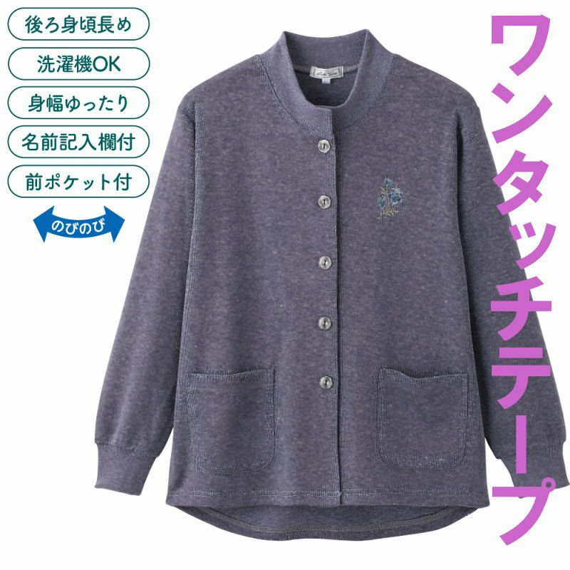 快適な日常生活をお過ごしいただけるためにお役立ていただける商品です【あなたにやさしいお洋服】着やすさとやさしい工夫がうれしい!機能性とお洒落を追求しました見た目はおしゃれなカーデ。工夫と機能性でラクラク!着心地もよくておすすめです。胸元の刺繍がアクセントに。【ワンタッチテープ】見た目は普通のボタンですが、裏がワンタッチテープで、開け閉めが簡単です。【後ろ身頃長め】背中や腰の曲がってきた方にもぴったりフィット!【身幅ゆったり】体を通しやすいゆったりとした身幅で、脱ぎ着がラクラク!着脱カンタン!様々な工夫ワンタッチテープ仕様でボタンが留めにくい方も脱ぎ着しやすい工夫を凝らした優しい設計です。手や指の負担も軽減します。着替えや検温時にはさっと開閉できます。飾りボタンで見た目は普通の洋服と変わりませんマジックテープ商品に関するご注意洗濯時にはゴミのなどの付着の原因になりますのでテープを張り合わせてください。後ろ身頃を長めにしているので、背中が曲がった方でも、背中が出にくい設計です。ゆったりした身幅で、脱ぎ着もしやすく、快適な着心地です。ポケットは大きめサイズなので、ちょっとしたものを入れたり、便利に使えます。名前記入欄付で間違い防止名前が書けるタグ付きなので、入院や施設入居時など、脱いだ後や洗濯後も他人のものと間違うことがありません。●品名/ワンタッチテープ丸首カーディ●色/青パープル・パープル・ネイビー●サイズ/M~L●素材/ポリエステル70%・綿30%、衿・袖リブ部分:ポリエステル60%・綿35%・ポリウレタン5%●生産国/中国製●仕様/洗濯機OK(ネット使用) 名前記入欄付 ワンタッチテープ 前ポケット付 後ろ身頃長め 身幅ゆったり のびのび●説明/胸元の刺繍がアクセントに。