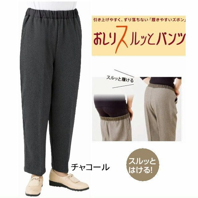 快適な日常生活をお過ごしいただけるためにお役立ていただける商品です寒い時期のお出かけにぴったりなアイテムです。人気の「おしりスルッとパンツ」シリーズが秋冬仕様になりました!繊維を毛羽立たせた裏起毛を使用し、体温で暖められた空気をしっかりとキャッチ、保温します。腰回りは安心の深ばき仕様です。腰元を包み込み、お腹周りを自然にカバー。ウエスト総ゴムで履き脱ぎが楽にできるのも嬉しいポイント。◆おしりスルッとパンツ の特徴【特徴1】おしりに引っかかりにくく、引上げやすい。①ゴム部分が表裏ともに滑る生地なので巻きこまず、一人で履きやすい。②滑る裏地付で引っかかりにくく、スルッと履きやすい【特徴2】ゆったりめのウエストゴムで引上げやすい。ウエストゴムを大きめに設定しているので手の力が弱くても引き上げやすい。【特徴3】ズボンが下までずり落ちにくい前2ヶ所に滑り止めが付いていて、トイレで座ってもずり落ちにくい。名前記入欄付で間違い防止名前が書けるタグ付きなので、入院や施設入居時など、脱いだ後や洗濯後も他人のものと間違うことがありません。●品名/【婦人裏起毛おしりスルッとパンツ S・M・L・LL・3L】 A1198561 婦人服 レディースファッション●色/ブラウン・チャコール●サイズ/S・M・L・LL・3L●素材/ポリエステル95%・ポリウレタン5%、裏地:ポリエステル100%●生産国/中国製●仕様/寒い時期のお出かけにぴったりなアイテムです。●説明/ウエスト総ゴム 裏起毛 名前記入欄付 洗濯機OK 両脇ポケット付 ゴムの取りえ可能 秋冬用 新登場 抗菌防臭 裏起毛 股下60㎝