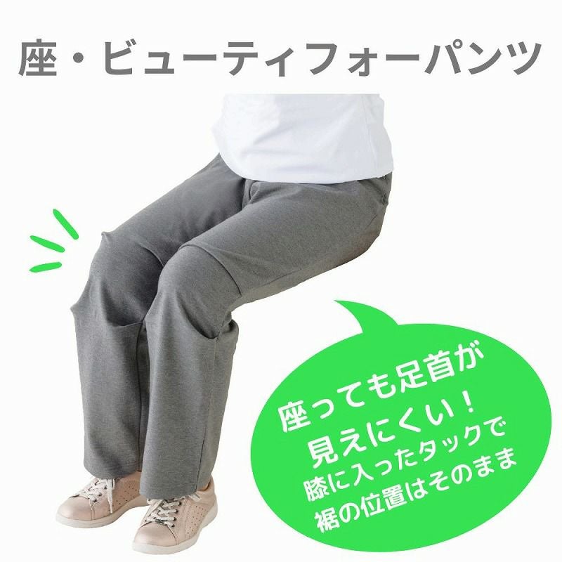 快適な日常生活をお過ごしいただけるためにお役立ていただける商品です着やすさとやさしい工夫のアイテムです裾が上がらず気分が上がる!「座・ビューティフォーパンツ」座席や車いすに座った時でもパンツの裾が上がらず、足首が見えにくいパンツを作りました。スウェット素材でやわらかく快適なはき心地。名前記入欄付で間違い防止名前が書けるタグ付きなので、入院や施設入居時など、脱いだ後や洗濯後も他人のものと間違うことがありません。●品名/婦人 座・ビューティフォーニットパンツ(婦人) 年間用●色/グレー・ブラック●サイズ/M・L・LL●素材/ポリエステル71%・レーヨン27%・ポリウレタン2%●生産国/中国製●仕様/ウエスト総ゴム 車いす用ボトム説明 後ろ股上・膝タックアップ 洗濯機OK(ネット使用) 名前記入欄付 洗濯機OK(ネット使用) ゴムの取替え可能 年間 ●説明/裾が上がらず気分が上がる!「座・ビューティフォーパンツ」座席や車いすに座った時でもパンツの裾が上がらず、足首が見えにくいパンツを作りました。スウェット素材でやわらかく快適なはき心地。