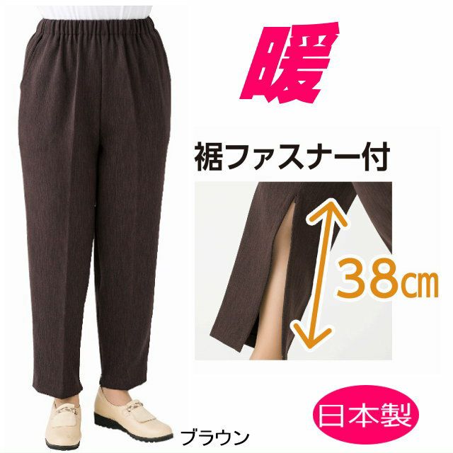 快適な日常生活をお過ごしいただけるためにお役立ていただける商品です秋冬のお出かけに暖かなパンツ太陽光を熱に変換する保温素材を使用。暖かなはき心地で秋冬のお出かけに最適。国産素材を使ったはき心地抜群のパンツ。シルエットの美しさも自慢です。「裾ファスナーパンツ」の特徴診療所などで足を見せる時、裾をまくるのは大変…そんな悩みを解決!面倒だったパンツの着脱をしなくても、スッとファスナーを上下するだけでOK 。より簡単に、裾を左右に引っ張るだけでも膝まで大きく開きます。湿布やサポーターをするときも便利!ファスナーは内側に同色であしらっていますので、普段は目立ちません。見た目は通常のパンツなので、おしゃれに軽やかに装ってください。ウエスト総ゴム 丈直し不要の選べる股下丈 裾ファスナー ナノヒーティング 洗濯機OK 名前記入欄付 両脇ポケット付 ゴムの取替え可能●品名/【婦人ナノヒーティング裾ファスナーパンツ 秋冬用 M・L・LL・3L(股下55、60、65㎝)】 fcf98563 婦人服 レディースファッション●色/ブラック・グレー・ブラウン●サイズ/M・L・LL・3L(股下55、60、65㎝)●素材/ポリエステル100%●生産国/日本製●仕様/秋冬のお出かけに暖かなパンツ。●説明/ウエスト総ゴム 丈直し不要の選べる股下丈 裾ファスナー ナノヒーティング 洗濯機OK 名前記入欄付 両脇ポケット付 ゴムの取替え可能
