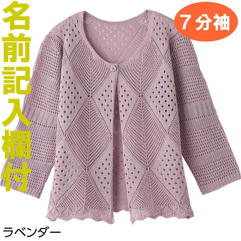 快適な日常生活をお過ごしいただけるためにお役立ていただける商品です着やすさとやさしい工夫のアイテムですさっと羽織れて着回しがききます。羽織りものとして、一枚あるとお出かけに便利です軽快な大人の遊び心を弾ませてデイリーの着こなしをレベルアップ清涼感のある素材で肌触りも良く快適。●品名/7分袖透かしダイヤ柄トッパーカーディガン●色/グレージュ・シルバーグレー・ラベンダー・ネイビー●サイズ/M-L●素材/ポリエステル100%●生産国/韓国製●仕様/洗濯機OK 名前記入欄付 身幅ゆったり 7分袖●説明/さっと羽織れて着回しがききます。羽織りものとして、一枚あるとお出かけに便利です軽快な大人の遊び心を弾ませてデイリーの着こなしをレベルアップ清涼感のある素材で肌触りも良く快適。