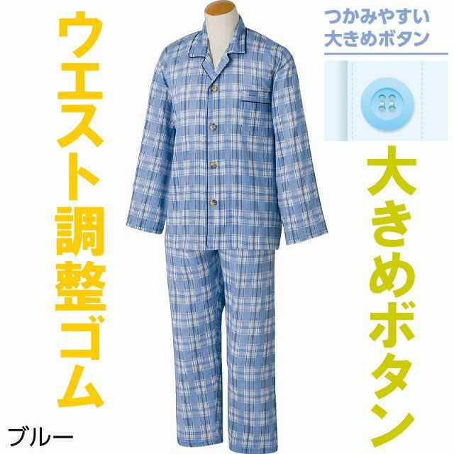 快適な日常生活をお過ごしいただけるためにお役立ていただける商品ですサラッと清涼感の綿100%楊柳素材。【楊柳素材】暑い夏も涼しく快適な楊柳素材表面のシボにより、サラッとした肌触りで、気持ちよく着られます。着脱カンタン!様々な工夫脱ぎ着しやすい工夫を凝らした優しい設計です。つかみやすい大きめボタンで手の力が弱くてもボタンの留め外しがラクラクです。一般のボタンに比べてつかみやすい大きめボタンを採用。この違いがご自身での着脱も簡単にしてくれます。ウエスト調整ゴム付なのでゴムを入れ替えなくてもウエストサイズを自由自在に調整できます。●品名/大きめボタン楊柳パジャマ●色/ブルー・グレー●サイズ/S・M・L・LL●材質/綿100% 楊柳●生産国/中国製●仕様/洗濯機OK 大きめボタン ウエスト調節ゴム付き 春夏用 ※柄は若干変更になる場合もございます。●説明/清涼感あふれる楊柳素材だから涼しく暑い夏も快適。