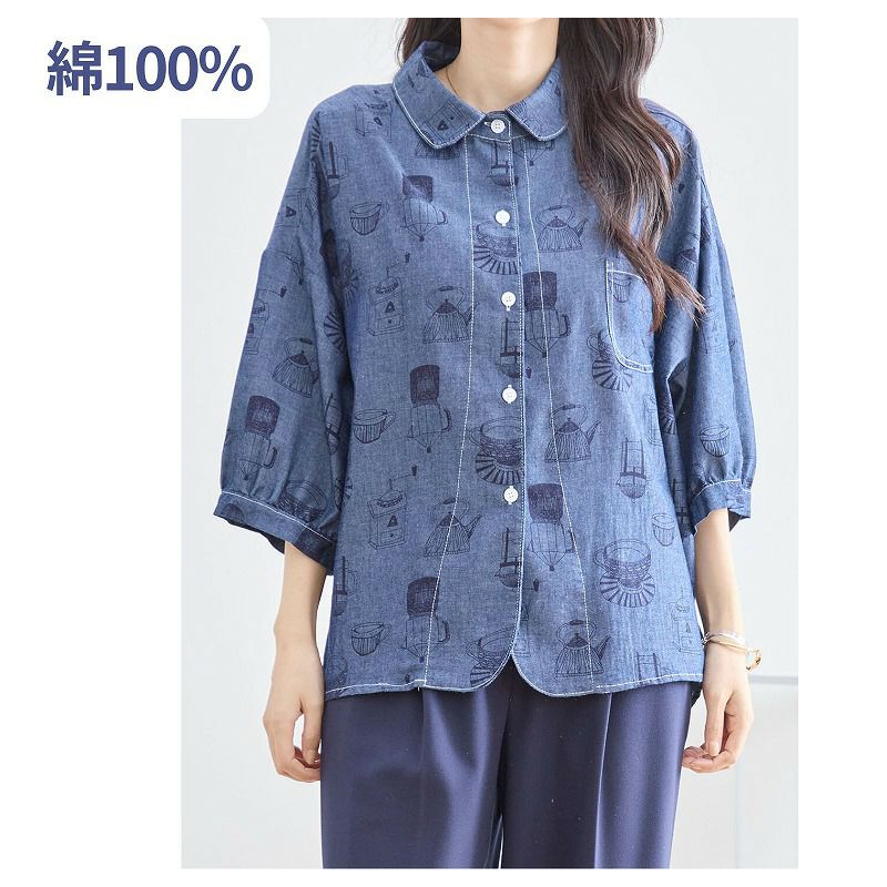 快適な日常生活をお過ごしいただけるためにお役立ていただける商品です軽やかな薄手のデニム風素材で暑い季節も涼しく着られる綿100%のシャツです。衿付きのデザインできちんと感もあり、1枚で着るのはもちろん羽織りとしても活躍します。●品名/婦人カフェ柄プリントデニムシャツ●色/ブルー●サイズ/M-L※平置き寸法は目安としてご覧ください。素材や縫製の特性上、多少の誤差が生じる場合がございます。あらかじめご了承ください。●素材/綿100%●生産国/中国製●仕様/洗濯機OK●説明/軽やかな薄手のデニム風素材で暑い季節も涼しく着られる綿100%のシャツです。カフェ柄のプリントがさりげなく映え、シンプルなコーディネートも華やかに。衿付きのデザインできちんと感もあり、1枚で着るのはもちろん羽織りとしても活躍します。綿素材で肌ざわりもやさしく季節の変わり目や冷房対策にもおすすめです。