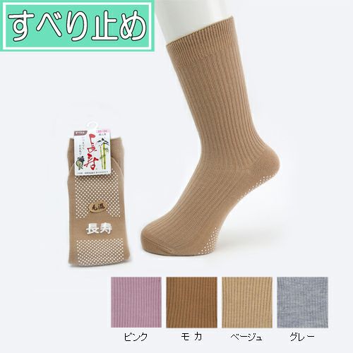 >床など滑りやすい所でも安心のすべり止め付きです。はき口はゆったりやさしいはき心地です。父の日、母の日、敬老の日などのプレゼントにも最適です。 はき心地ゆったり、安心のすべり止め付き。大人気。ロングセラー商品 裏面のすべり止めゴム(つぶつぶ)が、安心した歩行をサポートします。 長寿 のロゴ入り。 長寿 のロゴ も“つぶつぶ”も、すべりどめ素材となっております。父の日、母の日、敬老の日、クリスマス等には特に大量にご注文をいただきます為、それらの日前後をご検討中の方はお早目のご注文をお願いいたします。グレー、ピンク、ベージュ、モカ の各カラーからお選び下さい。すべり止め部分の「つぶつぶ」と「長寿」のロゴは白色です。●サイズ/22~24cm●素材/アクリル、ナイロン、毛、ポリウレタン●生産国/日本●スベリ止め加工丈の長さ(カカトから足首までの置き寸)=約 17cm