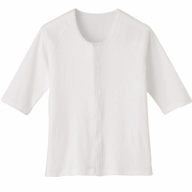 中厚ニットの丈夫な肌着。綿100%のやさしい肌ざわりです。しっかり留まるホック式。袖の長さは七分袖です。裏側は直接ホックが当たりません 日本エンゼル●サイズ/LL(身長:172~182cm 胸囲:98~108cm)●素材/スムース(綿100%)●洗濯可●脱水可●乾燥機可(60℃)