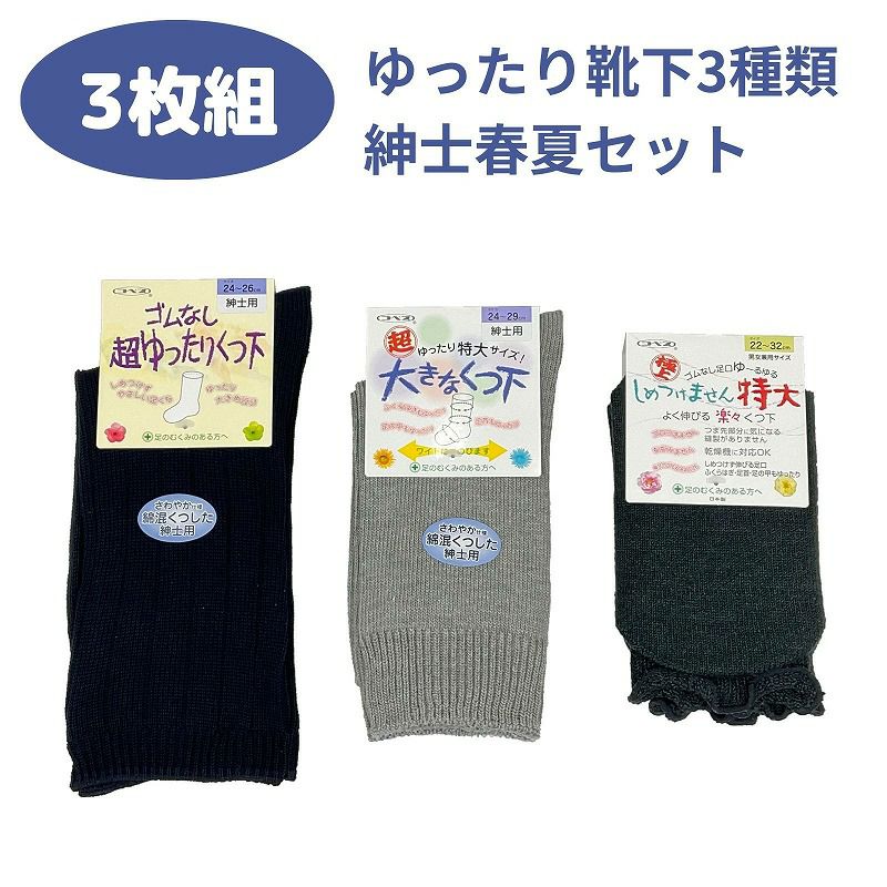 快適な日常生活をお過ごしいただけるためにお役立ていただける商品です足を締めつけにくく、快適な履き心地のゆったり靴下をお得に試せる3種類セット。異なるゆったり靴下を一度に試せるので、ご自身に合った履き心地を見つけたい方にぴったりです。通常の単品購入より少しお得なセット価格でご用意しました。まずはお試しセットで履き心地を体感してみませんか?プレゼントにもおすすめです。●品名/紳士ゆったり靴下お試し3種セット 春夏用●色/3種セット(写真の色が入ります)●生産国/日本製●仕様/以下の3種類が入ります。●品名/ゴム無しゆったりくつ下(綿混) 紳士用 春夏用 ●サイズ/24-26cm(足口回り22~34cm)丈の長さ(カカトから足首までの置き寸)=約 26cm●素材/綿、ナイロン●生産国/日本●仕様/ゴムなしゆったり成型くつ下 ●品名/超ゆったりくつ下特大タイプ(むくみ用)紳士用 春夏用 ●サイズ/24~29cm(円周18~45cm対応)丈の長さ(カカトから足首までの置き寸)=約 24cm●素材/綿、ポリエステル、ポリウレタン●生産国/日本●仕様/ゆったり成型くつ下 ●品名/極上しめつけません 特大サイズ 男女兼用 ●サイズ/22-32㎝●材質/綿、アクリル、ナイロン、ポリウレタン●生産国/日本●仕様・説明/よく伸びる楽らく靴下
