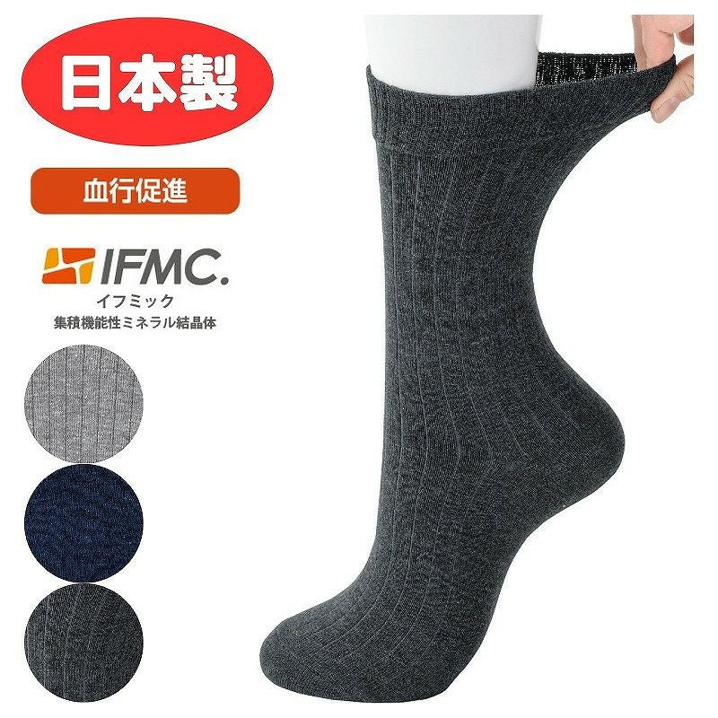 快適な日常生活をお過ごしいただけるためにお役立ていただける商品ですやさしい工夫のアイテムですこんなお悩みありませんか・・?施設の空調が効きすぎて夏でも寒い・・年々、冷えを感じやすくなったどれだけ重ね着をしても体の芯は温まらないそんなときは「着るサプ」!使い続けることで効果を実感!温泉の研究から作った、血行促進効果ができる「着るサプ」。温泉の効果に着眼して開発した血行促進素材を繊維に加工させて作りました。着用し続けることで効果を実感してみてください。濃い色のソックスにも名前が書けます。●品名/着るサプIFMC.足首ゆったり名前の書けるソックス●色/チャコール・ネイビー・グレー●サイズ/24~26cm●素材/綿・アクリル・ポリエステル・ポリウレタン●生産国/日本製●仕様/名前書きスペース 足首ゆったり 抗菌防臭 足首まわりゆったり25cm●説明/濃い色のソックスにも名前が書けます。IFMC.(イフミック:集積機能性ミネラル結晶体)は(株)テイコク製薬社が温泉療法に着眼して製造したナノメーターレベルの非常に微小なミネラルの結晶体です。 数種類の鉱物を組み合わせて鉄分の多い温泉水に一定時間浸漬し、その溶出液を特殊処理して抽出した物質です。身体に近接させることで血管から一酸化窒素(NO)が拡散し、血管が拡張することによる血行促進効果が期待できます。