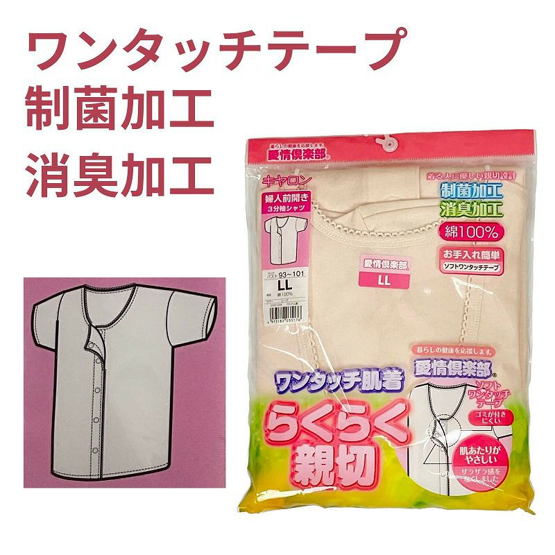 快適な日常生活をお過ごしいただけるためにお役立ていただける商品です着脱簡単らくらく仕様 ワンタッチ設計の前開き肌着 丸型ワンタッチテープ付 着やすく脱ぎやすい親切仕様開け閉めがサっとできるから着替えがらくらく!!ボタンが苦手な方におすすめのワンタッチテープ式肌着肌にやさしい綿100%素材を使用。抗菌防臭、消臭機能付きです。●品名/愛情倶楽部 婦人 ソフトワンタッチ半袖シャツ●色/ホワイト●サイズ/L・LL●材質/綿100%●生産国/ベトナム製●仕様・説明/ワンタッチテープ 洗濯機OK 抗菌防臭+消臭 半袖 年間素材●説明/ボタンが苦手な方におすすめのワンタッチテープ式肌着。マジックテープ商品に関するご注意洗濯時にはゴミのなどの付着の原因になりますのでテープを張り合わせてください。