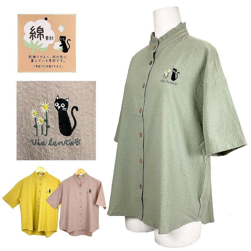 快適な日常生活をお過ごしいただけるためにお役立ていただける商品です【カジュアルスタイル】軽快な大人の遊び心を弾ませてデイリーの着こなしをレベルアップ綿100%の天然素材で肌に優しく快適です。ゆったり大きめサイズで、着心地ラクラク。透けない生地で、1枚でも着られます。衿元が大きく開くのが苦手な方に。首が日焼けしません。●品名/婦人綿100%衿フリルシャツネコちゃんブラウス●色/ピンク、イエロー、グリーン●サイズ/M・L●素材/本体:綿100%、刺繍部分:ポリエステル100%●生産国/バングラデシュ製●仕様/M:肩:56㎝、袖丈:22㎝、バスト:112㎝、着丈:64/68㎝、L:肩:57㎝、袖丈:22㎝、バスト:118㎝、着丈:65/69㎝、採寸は平置きにして測っていますので、素材等により若干の誤差があることがございます●説明/綿100%の天然素材で肌に優しく快適です。ゆったり大きめサイズで、着心地ラクラク。透けない生地で、1枚でも着られます。衿元が大きく開くのが苦手な方に。首が日焼けしません。