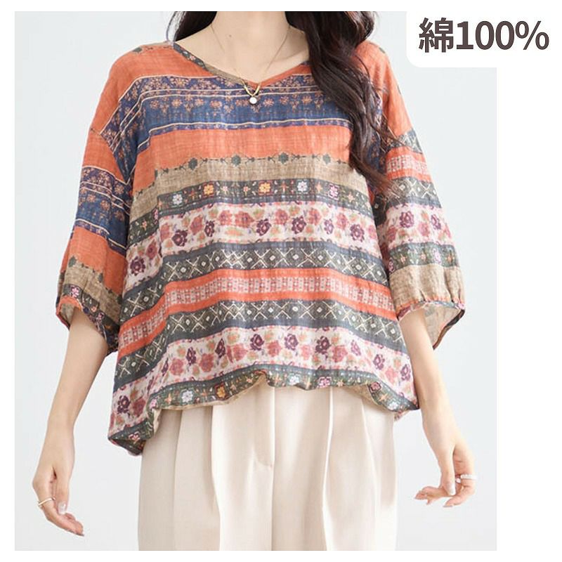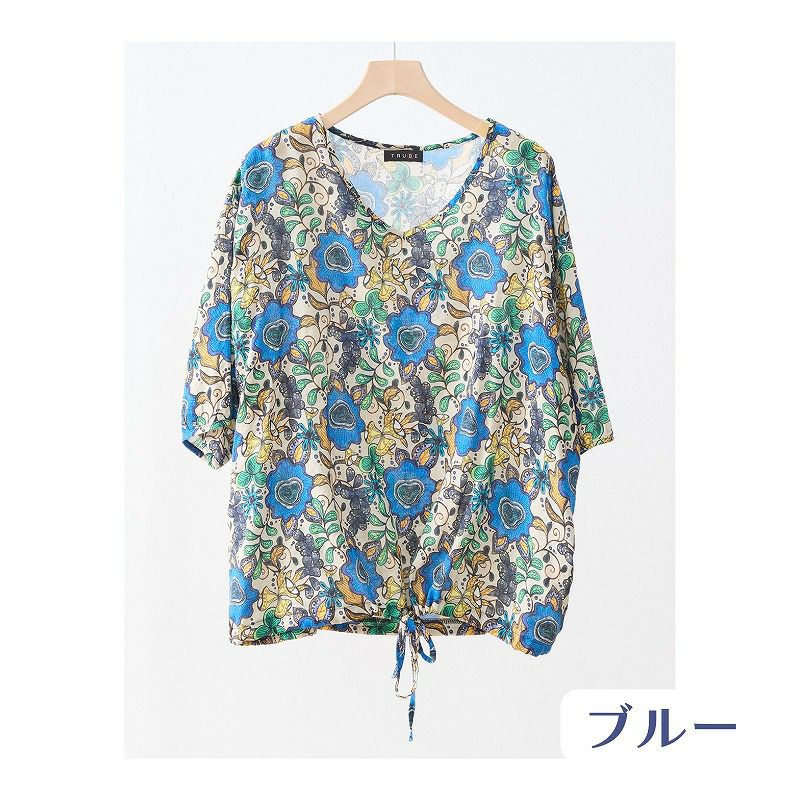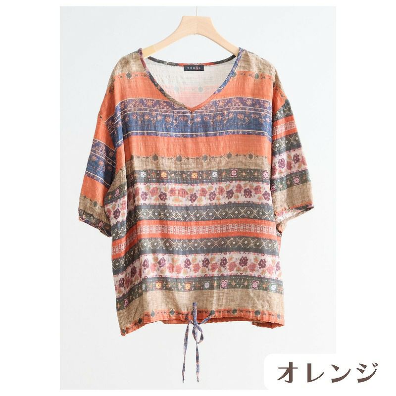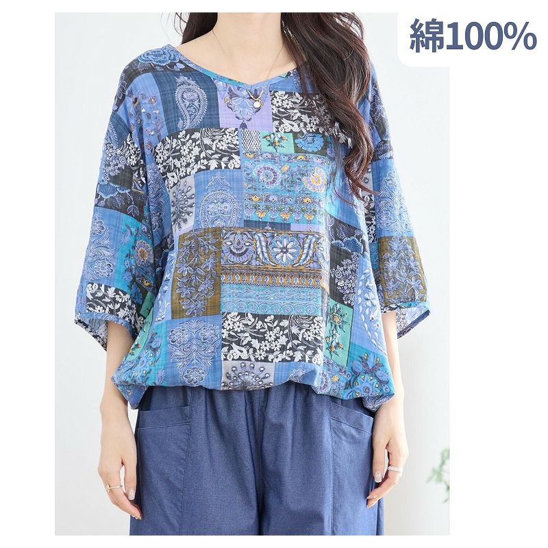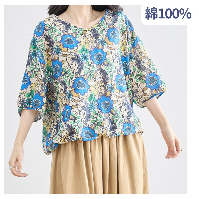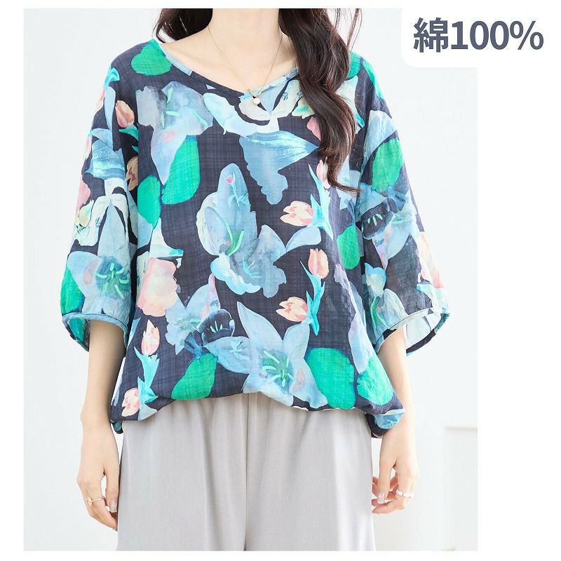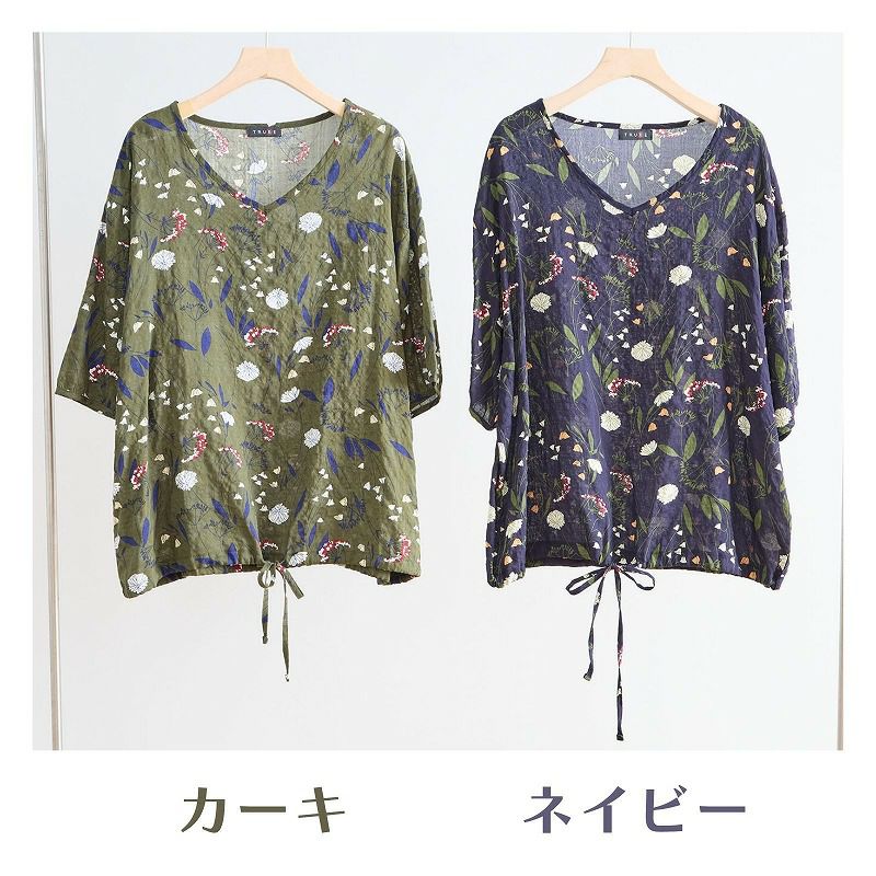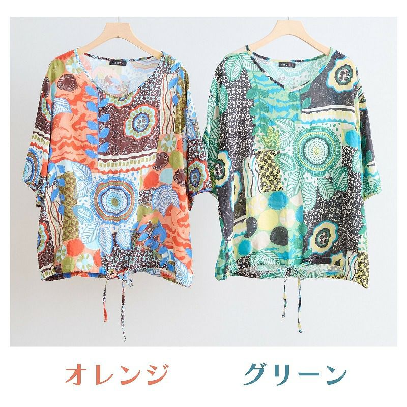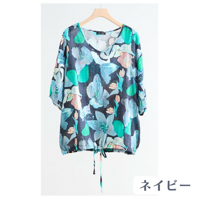 【婦人アート柄コットンVネックコットンブラウス(裾ひも入り) L-LL】ds13103 綿100%