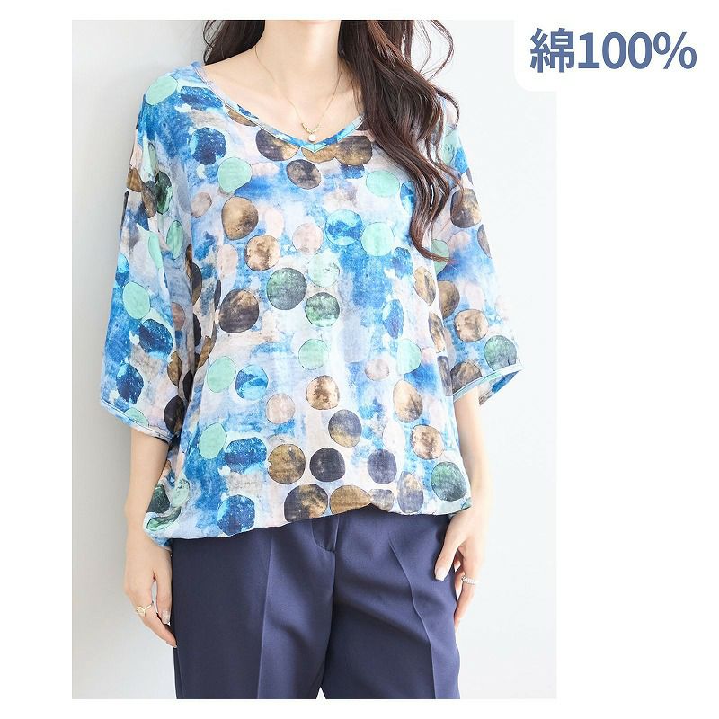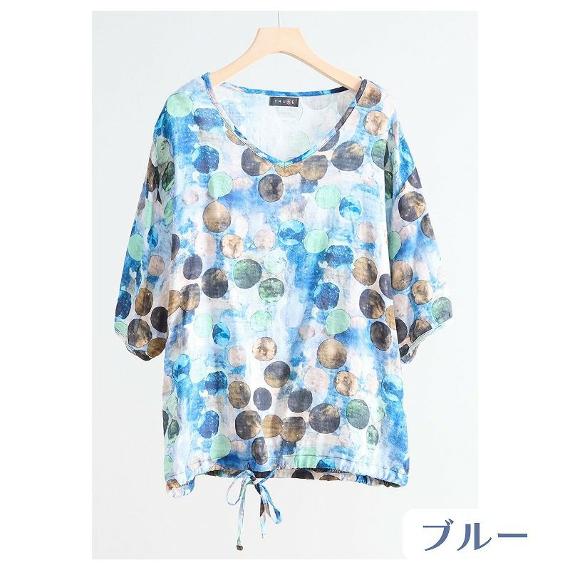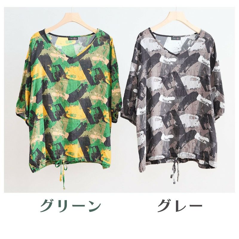 【婦人アートペイント柄Vネックコットンブラウス(裾ひも入り) L-LL】ds13260 綿100%