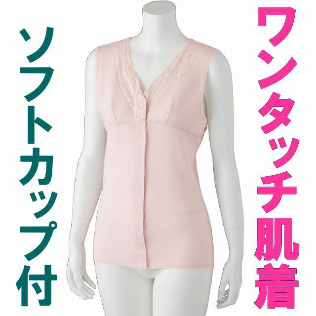 快適な日常生活をお過ごしいただけるためにお役立ていただける商品です◆ 一枚で着られるソフトカップ付き ◆Vレースがおしゃれな、肌に優しい綿100%素材を使用。【ワンタッチテープ】ボタンが苦手な方でも片手で着脱できるワンタッチテープ使用。【ソフトカップとは】胸の裏面を補強している布のことで、バストをやさしく包み、また繊維の伸びを防ぎます。やさしくバストをつつむ、ソフトカップ付。 ソフトカップ付で楽な着心地後ろ身頃長め ソフトカップ付 胸元レースは直接肌にあたりません●品名/ソフトカップ付ワンタッチラン型シャツ●色/ピンク●サイズ/M・L・LL●材質/綿100%●生産国/中国製●仕様・説明/洗濯機OK 抗菌防臭+保湿 春夏用●説明/やさしくバストをつつむ、ソフトカップ付。 ソフトカップ付で楽な着心地後ろ身頃長め ソフトカップ付 胸元レースは直接肌にあたりませんマジックテープ商品に関するご注意洗濯時にはゴミのなどの付着の原因になりますのでテープを張り合わせてください。 快適な日常生活をお過ごしいただけるためにお役立ていただける商品です ソフトカップ付で胸が透けることを気にせず1枚で着用していただけます。天然素材綿100%なのでやわらかく優しい肌触り。抗菌防臭消臭加工で衛生的。 【ブラジャーを着ける煩わしさ解消。1枚で快適に着用できます。】ブラジャーのような締め付けがないので、着ていてとにかく楽チンなカップ付インナー。しかも前開きなので着替えもラクラク! ワンタッチ肌着で前が開くので着脱が楽です開け閉めがさっとできるから着替えがラクラク!着やすく脱ぎやすい親切設計!前開きなので一人でも簡単につけることができます 前後差設計で、前かがみ気味の方にオススメです後ろ身が長いので背中が出にくい設計です裾にもお洒落なレースを使っています。 前立てすっきり仕様●襟の位置で止めているので垂れ下らない。●裏面を布で補強して伸びを防ぎます。●肌綿が平らになり痛くなりにくい。●レースが肌に触れにくい仕様です。 ソフトカップ付で胸のことを気にせず1枚で着用していただけます。前後差設計で、前かがみ気味の方にオススメです後ろ身が長いので背中が出にくい設計ですワンタッチ肌着で前が開くので着脱が楽です綿100%で抗菌防臭消臭加工前立てすっきり仕様