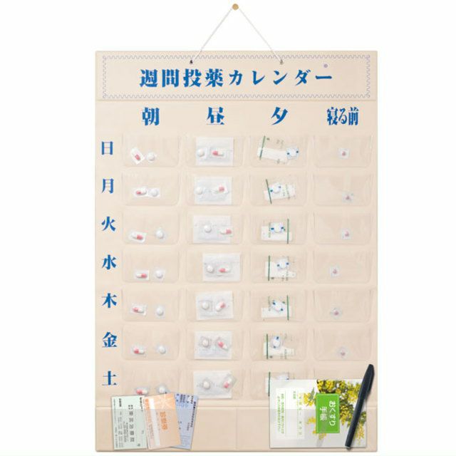 快適な日常生活をお過ごしいただけるためにお役立ていただける商品です商品の説明・壁掛け式で省スペース。一目で薬の飲み忘れが確認できます。・在宅介護・服薬指導に!・ポケットは、マチ付き。・下部ポケットには、診察券・健康保険証・お薬手帳などの収納ができます。・水性マジック(ホワイトボード用)で書き込みOK。(ティッシュで消せます)※書き込めるのは透明部分だけです。