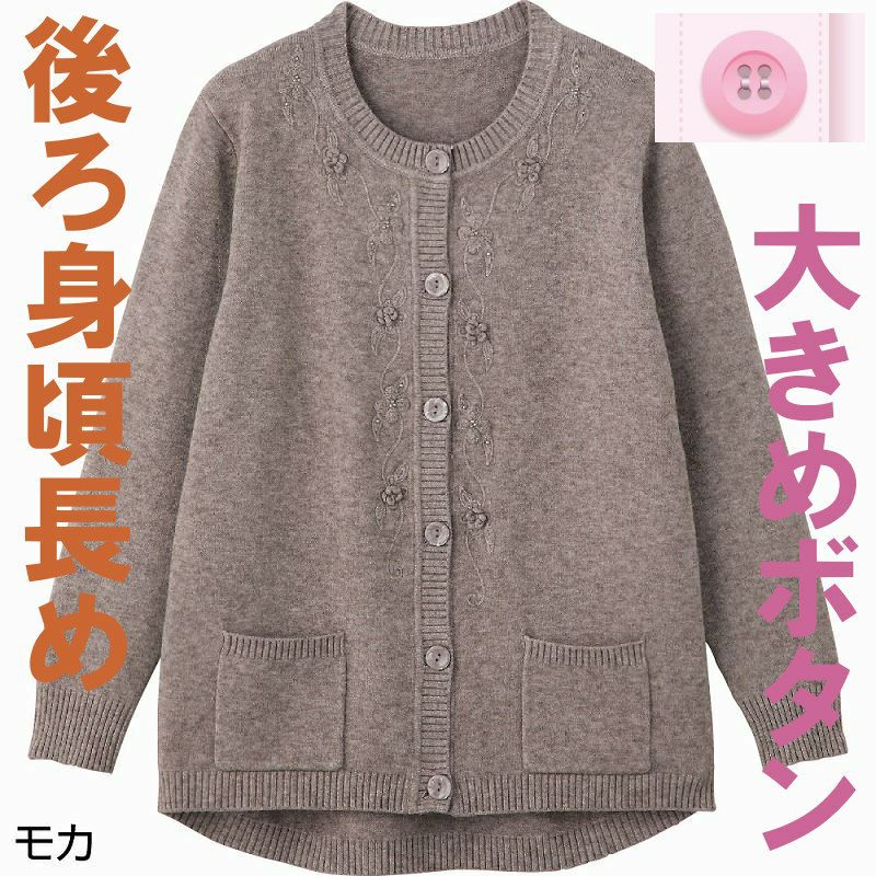 快適な日常生活をお過ごしいただけるためにお役立ていただける商品です【あなたにやさしいお洋服】着やすさとやさしい工夫がうれしい!機能性とお洒落を追求しました着心地もよくておすすめです。柔らかくて肌触りがもちもちのふわふわニット。【程よい弾力感でやみつきになるもちもちニット】優しく身体を包み込み、寒い日も快適に!洗濯機で洗えるのもうれしい!部屋の中でも外出時にも活躍します。【身幅ゆったり】体を通しやすいゆったりとした身幅で、脱ぎ着がラクラク!首元から胸元にかけた刺繍で華やかに。着脱カンタン!様々な工夫力が入りやすくつかみやすい大きめボタンで留め外しがスムースで脱ぎ着しやすい工夫を凝らした優しい設計です。ポケットは大きめサイズなので、ちょっとしたものを入れたり、便利に使えます。後ろ身頃を長めにしているので、背中が曲がった方でも、背中が出にくい設計です。ゆったりした身幅で、脱ぎ着もしやすく、快適な着心地です。名前記入欄付で間違い防止名前が書けるタグ付きなので、入院や施設入居時など、脱いだ後や洗濯後も他人のものと間違うことがありません。●品名/婦人もちもちニット斜め釦ホールカーディガン●色/フジ・モカ・ブルー●サイズ/M~L・LL・3L●素材/レーヨン50%・ポリエステル30%・ナイロン20%●生産国/中国製●仕様/洗濯機OK(ネット使用) 名前記入欄付 大きめボタン&斜めボタンホール 前ポケット付 後ろ身頃長め 身幅ゆったり 3Lサイズあり●説明/首元から胸元にかけた刺繍で華やかに。