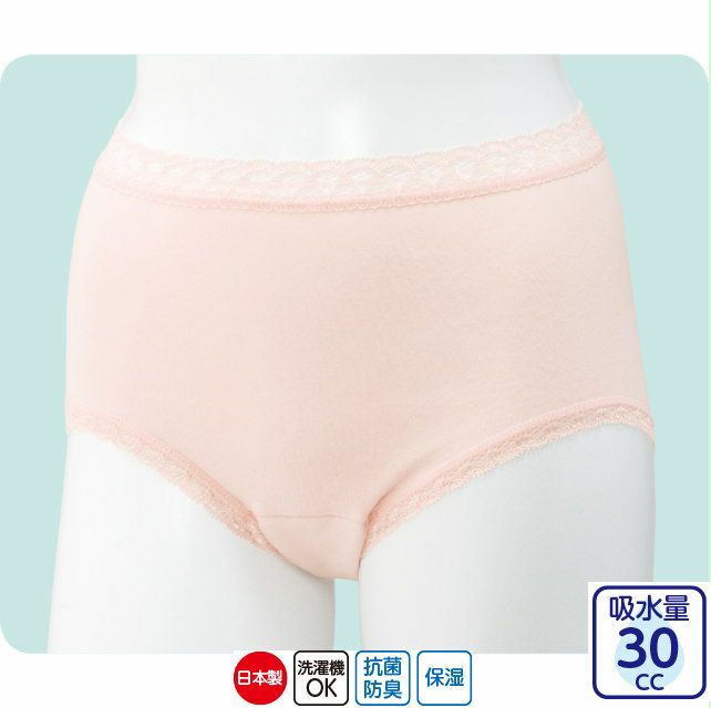 ◆ スキンケア加工でしっとりうるおい ◆30CCまでの尿漏れをキャッチ。スキンケア加工の生地でお肌にしっとりとうるおい。はきこみが深くて安心の、上品な天レースデザイン。【軽失禁】くしゃみをした時、何かを持ち上げた時など、ちょっとした尿漏れが気になる方におすすめのタイプです。安心薄型吸収帯30ccまでの尿漏れをキャッチ。パット部分は抗菌防臭加工なので安心です。吸水帯一体型