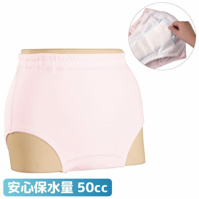旅行や長時間のお出かけにも安心、婦人用ケアパンツ。パッドを使用する際のズレを防止するポケットが付いています。水分を吸水布のみに閉じ込め、縫い目や縁からのしみ出しをしっかりブロックします。ソフトな吸水布を使用してますので、股部分のごわつきがありません。気になるニオイを吸収し分解する消臭加工付き。安心保水量は50ccです。※エンゼルでは外衣にしみださない保水量を【安心保水量】と表示しています。