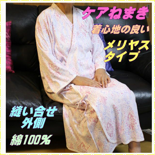 快適な日常生活をお過ごしいただけるためにお役立ていただける商品です 柔らかくて伸縮性のあるメリヤスを使用・柔らかくて伸縮性のあるメリヤスを使用し、縫い合わせは全て外側にしているので、非常に肌に優しい寝巻です肌への刺激が軽減されます。 着心地と使いやすさにこだわりました。着せ替えのしやすいパンツの無いねまきタイプです天然素材綿100%使用で肌に優しく着心地がよいです。パンツがないのでオムツ交換がらくです ●縫い合わせはすべて外側なので、お肌にあたりません。 ●縫い合わせを外側にしていますので、床ずれのリスクを解消します。 ●胸元がはだけない内側ボタン付き。つかみやすい大きめボタンだから、ご自身での着脱もラクです。一般のガーゼねまきでは胸がはだけてしまいますがボタンがついているので、胸がはだけにくい設計です。 内ヒモと外ヒモで留めることで、着崩れしにくくなります。 ●ほどよくのびて着心地の良いメリヤス生地。 着心地と使いやすさにこだわりました。着せ替えのしやすいパンツの無いねまきタイプです天然素材綿100%使用で肌に優しく着心地がよいです。パンツがないのでオムツ交換がらくです ●素材/スムース 綿100%●洗濯機OK●脱水機OK●乾燥機OK(60°c) 【メリヤスとは?】ニットと同義語。編物のことを昭和30年代頃まで、一般にメリヤスといいました。以後、編物の急激な発展により、外衣までも含めた衣料の主要生地となったため、肌着、靴下のイメージの強いメリヤスから順次ニットということばに移行しました。伸縮自在で編物のような布地。1本または数本の糸で輪(ループ)を次々につくりながら編みます。機械を用いてよく伸縮するように編んだ生地、または製品をメリヤスといいます。特徴としては・伸縮性が大きい ・ドレープ性がある ・しわになりにくい ・ソフトな風合いがある ・カジュアル的である、などがあります。