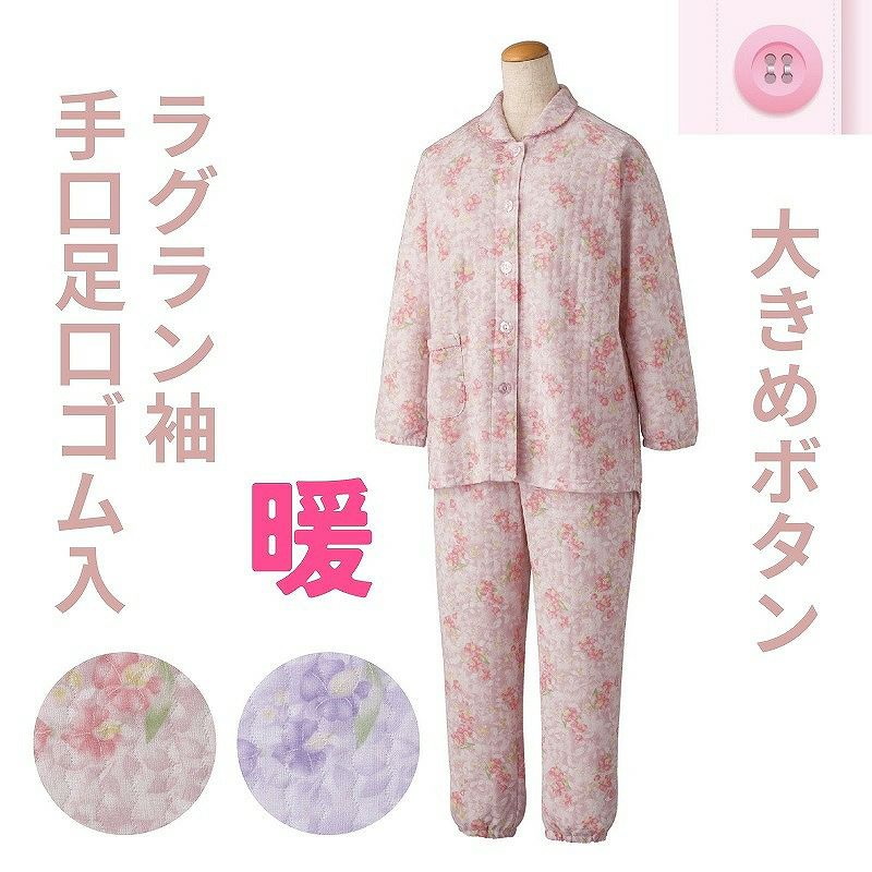 快適な日常生活をお過ごしいただけるためにお役立ていただける商品です着やすさとやさしい工夫のアイテムです暖かい空気を逃しにくい秋冬に最適な保温性のよいキルト素材。ふんわり暖かなキルトパジャマです。着脱カンタン!様々な工夫脱ぎ着しやすい工夫を凝らした優しい設計です。つかみやすい大きめボタンで手の力が弱くてもボタンの留め外しがラクラクです。一般のボタンに比べてつかみやすい大きめボタンを採用。この違いがご自身での着脱も簡単にしてくれます。【手口・足口ゴム入り】手口と足口にゴム入りなので、めくれ上がりにくい設計です。【動きやすいラグラン袖】肩まわりがゆったりしているので、肩や腕が動かしやすく、脱ぎ着がしやすい仕様です。後ろ身頃を長めにしているので、背中が曲がった方でも、背中が出にくい設計です。ウエスト調整ゴム付なのでゴムを入れ替えなくてもウエストサイズを自由自在に調整できます。●品名/大きめボタンキルトパジャマ●色/ピンク・パープル●サイズ/S・M・L・LL●素材/ポリエステル80%・綿20%●生産国/中国製●仕様/キルト ※柄は若干変更になる場合もございます。 洗濯機OK 大きめボタン 後ろ身頃長め 動きやすいラグラン袖 秋冬用 ウエスト調節ゴム付 手口・足口ゴム入り●説明/暖かい空気を逃しにくい秋冬に最適な保温性のよいキルト素材。ふんわり暖かなキルトパジャマです。