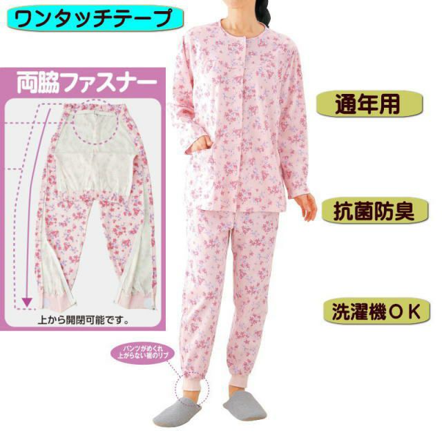 ◆ 両脇ファスナーで着替えやすさ抜群 ◆ゆったり仕立てのトップと両脇ファスナーパンツで着替えやすさ抜群。綿100%にゆったり??マチ仕様や足首リブ付きで、着心地にもこだわりました。【ワンタッチテープ】着替えや検温時の開閉が簡単。飾りボタン付で見た目は普通のパジャマです。【フルオープンファスナー】上から開閉できるフルオープンファスナーです。オムツ交換や着替えがラクにできます。【ウエストバンド付】ウエストバンド付きなので立ったままオムツ交換してもズレません。