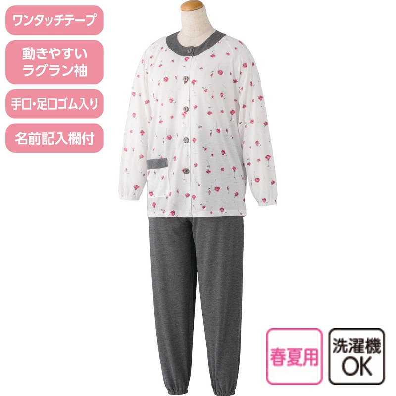 快適な日常生活をお過ごしいただけるためにお役立ていただける商品です着やすさとやさしい工夫のアイテムです薄手の天竺素材で夏も涼しく快適に着られるワンタッチ天竺パジャマ。ワンタッチテープで開け閉め簡単、ラグラン袖で腕まわりも動かしやすい設計です♪手口・足口ゴム入りでずれにくく安心。名前記入欄付きで施設利用にも便利、洗濯機OKでお手入れもラクな春夏パジャマです。着脱カンタン!様々な工夫【ワンタッチテープ】ボタンが留めにくい方は前合わせのワンタッチテープ仕様で、着替えがスムーズにワンタッチ肌着で前が開くので着脱が楽です開け閉めがさっとできるから着替えがラクラク!着やすく脱ぎやすい親切設計!前開きなので一人でも簡単につけることができます【手口・足口ゴム入り】手口と足口にゴム入りなので、めくれ上がりにくい設計です。マジックテープ商品に関するご注意洗濯時にはゴミのなどの付着の原因になりますのでテープを張り合わせてください。【動きやすいラグラン袖】肩まわりがゆったりしているので、肩や腕が動かしやすく、脱ぎ着がしやすい仕様です。名前記入欄付で間違い防止名前が書けるタグ付きなので、入院や施設入居時など、脱いだ後や洗濯後も他人のものと間違うことがありません。●品名/ワンタッチ天竺パジャマ●色/ピンク・ブルー●サイズ/M・L●素材/ポリエステル85%・綿15%●生産国/中国製●仕様/洗濯機OK(ネット使用) ワンタッチテープ 名前記入欄付 動きやすいラグラン袖 手口・足口ゴム入り 天竺 ※柄は若干変更になる場合もございます。●説明/薄手の天竺素材で夏も涼しく快適に着られるワンタッチ天竺パジャマ。ワンタッチテープで開け閉め簡単、ラグラン袖で腕まわりも動かしやすい設計です♪手口・足口ゴム入りでずれにくく安心。名前記入欄付きで施設利用にも便利、洗濯機OKでお手入れもラクな春夏パジャマです。