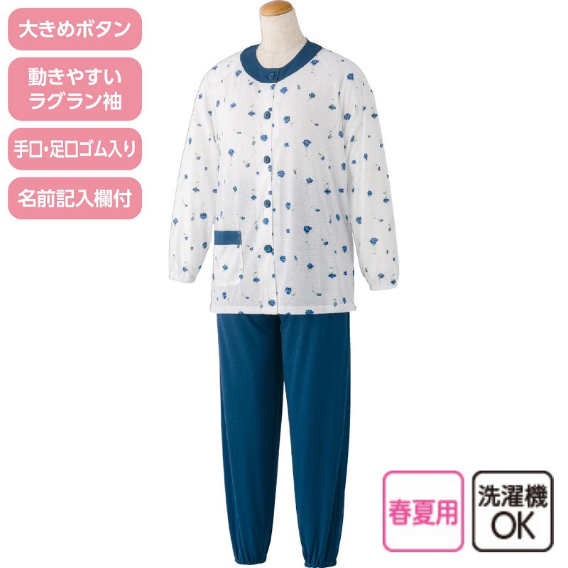 ●説明/さらっとした肌触りの天竺素材で軽やかに着られる大きめボタン天竺パジャマ。春夏にぴったりの涼しい着心地です♪大きめボタンで着脱しやすく、ラグラン袖で動きやすい快適設計。後ろ身頃長めで背中が出にくく、手口・足口ゴム入りでずれにくく安心。名前記入欄付きで施設利用にも便利、洗濯機OKで毎日清潔に使えます。