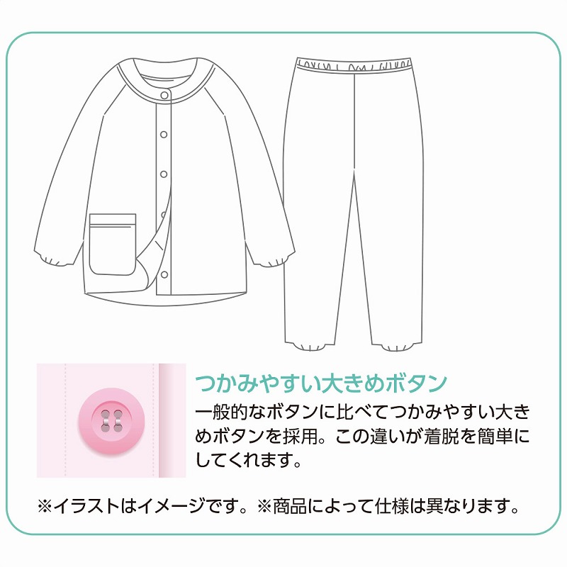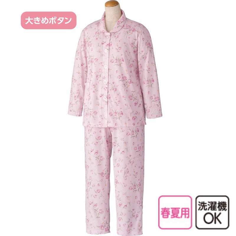 快適な日常生活をお過ごしいただけるためにお役立ていただける商品です着やすさとやさしい工夫のアイテムです軽くて柔らかな天竺素材で春夏も快適に着られる大きめボタン天竺プチサイズパジャマ。通気性がよく軽やかな着心地で暑い季節にもぴったり♪大きめボタンで着脱しやすく、身長が低めの方に合わせて丈を短めにしたプチサイズ仕様。バストやウエストはゆったりしたまま着られ、洗濯機OKでお手入れも簡単です。着脱カンタン!様々な工夫脱ぎ着しやすい工夫を凝らした優しい設計です。つかみやすい大きめボタンで手の力が弱くてもボタンの留め外しがラクラクです。一般のボタンに比べてつかみやすい大きめボタンを採用。この違いがご自身での着脱も簡単にしてくれます。●品名/大きめボタン天竺プチサイズパジャマ●色/ピンク・パープル●サイズ/S・M・L・LL(P)●素材/ポリエステル65%・綿35%●生産国/中国製●仕様/洗濯機OK(ネット使用) 大きめボタン 天竺 ※柄は若干変更になる場合もございます。●説明/軽くて柔らかな天竺素材で春夏も快適に着られる大きめボタン天竺プチサイズパジャマ。通気性がよく軽やかな着心地で暑い季節にもぴったり♪大きめボタンで着脱しやすく、身長が低めの方に合わせて丈を短めにしたプチサイズ仕様。バストやウエストはゆったりしたまま着られ、洗濯機OKでお手入れも簡単です。