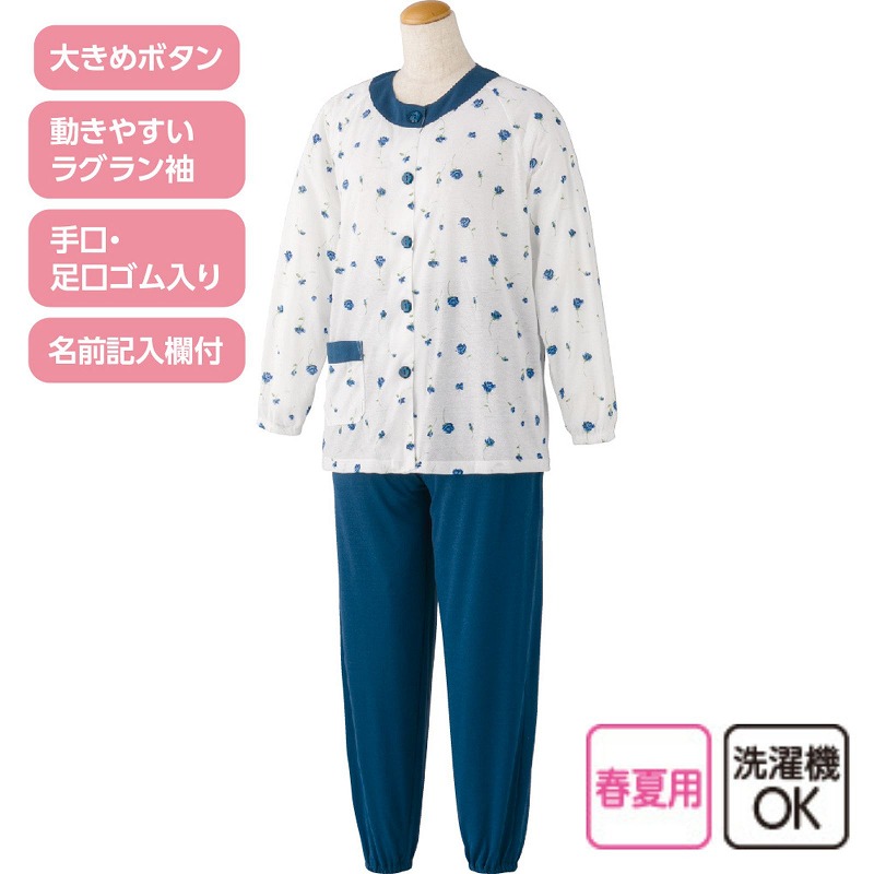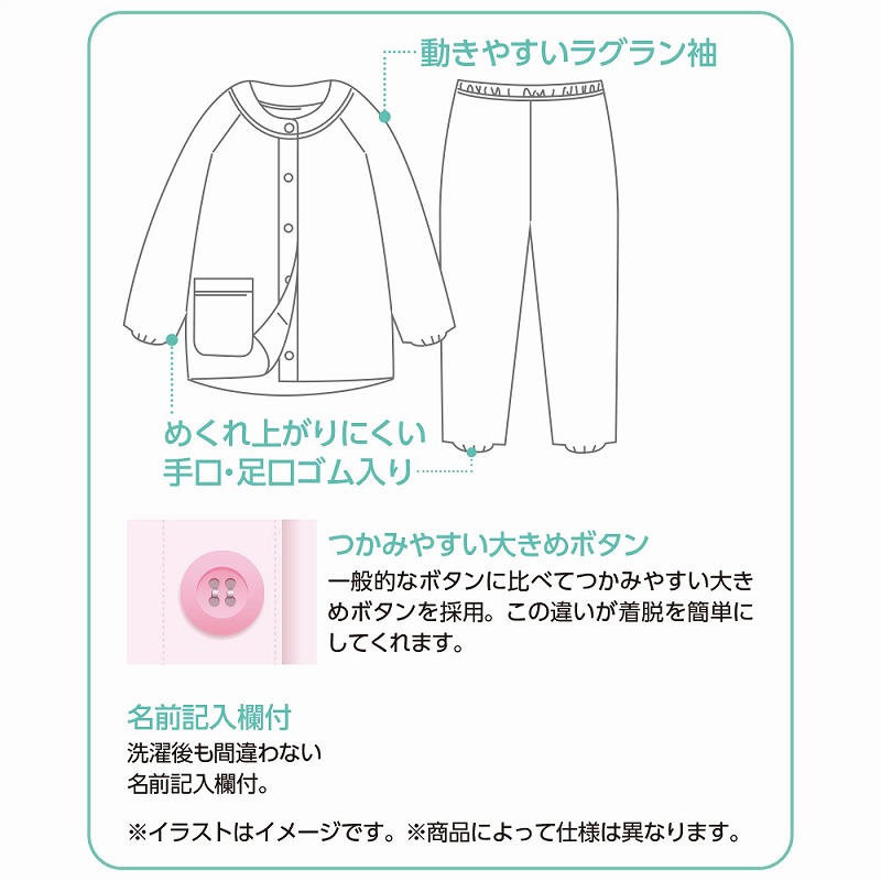 快適な日常生活をお過ごしいただけるためにお役立ていただける商品です着やすさとやさしい工夫のアイテムです薄手の天竺素材で夏も涼しく快適に着られる大きめボタン天竺プチサイズパジャマ。動きやすいラグラン袖で腕まわりもラクラク、手口・足口ゴム入りでずれにくく安心です♪大きめボタンで着替えも簡単。身長が低めの方に合わせて丈を短めにしたプチサイズ設計で、名前記入欄付きなので施設利用にも便利。洗濯機OKで毎日清潔に使えます。着脱カンタン!様々な工夫脱ぎ着しやすい工夫を凝らした優しい設計です。つかみやすい大きめボタンで手の力が弱くてもボタンの留め外しがラクラクです。一般のボタンに比べてつかみやすい大きめボタンを採用。この違いがご自身での着脱も簡単にしてくれます。【手口・足口ゴム入り】手口と足口にゴム入りなので、めくれ上がりにくい設計です。【動きやすいラグラン袖】肩まわりがゆったりしているので、肩や腕が動かしやすく、脱ぎ着がしやすい仕様です。名前記入欄付で間違い防止名前が書けるタグ付きなので、入院や施設入居時など、脱いだ後や洗濯後も他人のものと間違うことがありません。●品名/大きめボタン天竺プチサイズパジャマ●色/ピンク・ブルー●サイズ/M・L(P)●素材/ポリエステル85%・綿15%●生産国/中国製●仕様/洗濯機OK(ネット使用) 大きめボタン 名前記入欄付 手口・足口ゴム入り 動きやすいラグラン袖 天竺 ※柄は若干変更になる場合もございます。●説明/薄手の天竺素材で夏も涼しく快適に着られる大きめボタン天竺プチサイズパジャマ。動きやすいラグラン袖で腕まわりもラクラク、手口・足口ゴム入りでずれにくく安心です♪大きめボタンで着替えも簡単。身長が低めの方に合わせて丈を短めにしたプチサイズ設計で、名前記入欄付きなので施設利用にも便利。洗濯機OKで毎日清潔に使えます。