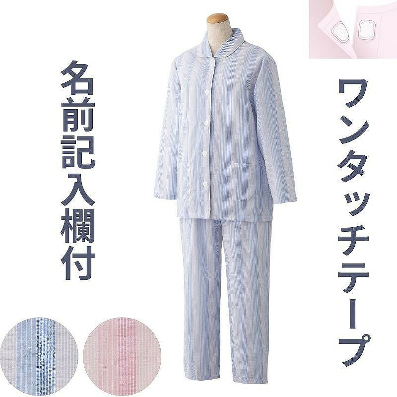 快適な日常生活をお過ごしいただけるためにお役立ていただける商品です着やすさとやさしい工夫のアイテムです【ワンタッチテープ】ボタンが留めにくい方は前合わせのワンタッチテープ仕様で、着替えがスムーズに着替えや検温時にはさっと開閉できます。 飾りボタン付で見た目は普通の洋服と変わりません爽やかな肌触りで涼しいサッカー素材着脱カンタン!様々な工夫【ワンタッチテープ】ボタンが留めにくい方は前合わせのワンタッチテープ仕様で、着替えがスムーズにワンタッチ肌着で前が開くので着脱が楽です開け閉めがさっとできるから着替えがラクラク!着やすく脱ぎやすい親切設計!前開きなので一人でも簡単につけることができます名前記入欄付で間違い防止名前が書けるタグ付きなので、入院や施設入居時など、脱いだ後や洗濯後も他人のものと間違うことがありません。マジックテープ商品に関するご注意洗濯時にはゴミのなどの付着の原因になりますのでテープを張り合わせてください。●品名/婦人ワンタッチサッカーパジャマ 春夏用●色/ピンク・サックス●サイズ/M・L●素材/ポリエステル65%・綿35%●生産国/中国製●仕様/洗濯機OK 名前記入欄付 ワンタッチテープ ※柄は若干変更になる場合もございます。●説明/【ワンタッチテープ】ボタンが留めにくい方は前合わせのワンタッチテープ仕様で、着替えがスムーズに着替えや検温時にはさっと開閉できます。 飾りボタン付で見た目は普通の洋服と変わりません爽やかな肌触りで涼しいサッカー素材