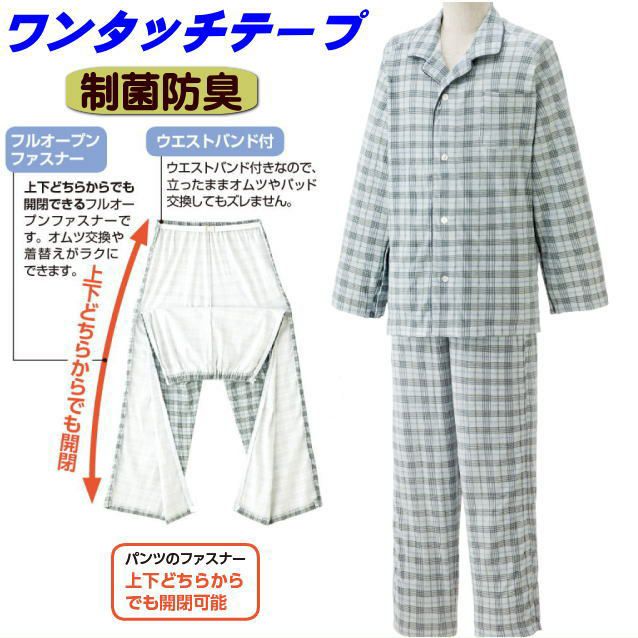 ◆ 充実した機能で手際良くサポート ◆【前合わせ+飾りボタン】見た目は普通のパジャマですが、ワンタッチテープ仕様で着替えや検温時の開閉が簡単です【袖口】点滴や検温に便利なオープンタイプです。【フルオープンファスナー】上下どちらからでも開閉できるフルオープンファスナーです。おむつ交換や着替えがラクにできます。【ウエストバンド付】ウエストバンド付なので、立ったままおむつやパッド交換をしてもズレません。上下ファスナーなので、パンツから必要な箇所でチューブが通せます。◎格子柄は若干変更になる場合もございます。