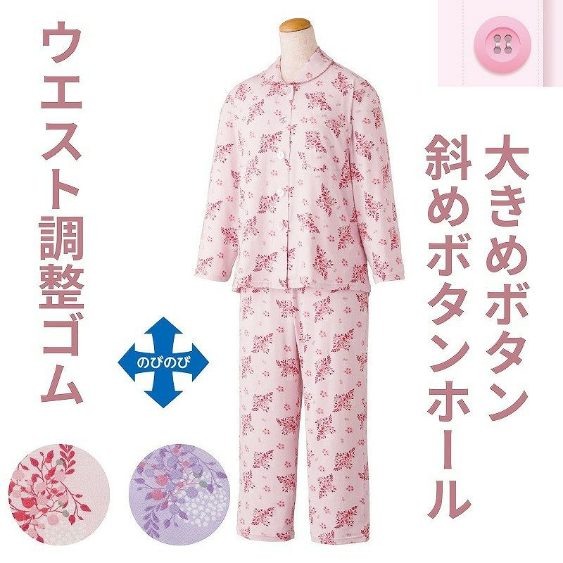 快適な日常生活をお過ごしいただけるためにお役立ていただける商品です着やすさとやさしい工夫のアイテムですのびのびストレッチで着脱らくらく。伸縮自在のストレッチ素材なめらかな風合いののびのび素材で快適ストレッチ素材で生地が伸びて力の弱い方でも楽にお着替えできます。好評ののびのび素材のプチサイズです。着脱カンタン!様々な工夫脱ぎ着しやすい工夫を凝らした優しい設計です。つかみやすい大きめボタンで手の力が弱くてもボタンの留め外しがラクラクです。一般のボタンに比べてつかみやすい大きめボタンを採用。この違いがご自身での着脱も簡単にしてくれます。【ななめボタンホール】ボタンホールを斜めにすることで、手指を動かしにくい方も比較的容易にボタンの留め外しができます。後ろ身頃を長めにしているので、背中が曲がった方でも、背中が出にくい設計です。ウエスト調整ゴム付なのでゴムを入れ替えなくてもウエストサイズを自由自在に調整できます。名前記入欄付で間違い防止名前が書けるタグ付きなので、入院や施設入居時など、脱いだ後や洗濯後も他人のものと間違うことがありません。やさしいパジャマ!様々な工夫【ストレッチパジャマ】親切設計!タテ・ヨコに伸びる素材で着脱簡単。着脱がラクなだけでなく寝返もラクにできます。のびのび素材だから腕が通しやすい!●品名/大きめボタンプチサイズのびのびストレッチパジャマ●色/ピンク・パープル●サイズ/S・M・L・LL●素材/ポリエステル95%・ポリウレタン5%●生産国/中国製●仕様/※柄は若干変更になる場合もございます。 洗濯機OK(ネット使用) 名前記入欄付 大きめボタン&ななめボタンホール 後ろ身頃長め のびのび ウエスト調節ゴム付●説明/のびのびストレッチで着脱らくらく。伸縮自在のストレッチ素材なめらかな風合いののびのび素材で快適ストレッチ素材で生地が伸びて力の弱い方でも楽にお着替えできます。好評ののびのび素材のプチサイズです。
