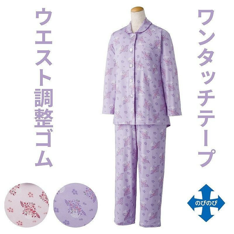 快適な日常生活をお過ごしいただけるためにお役立ていただける商品です着やすさとやさしい工夫のアイテムですのびのびストレッチで着脱らくらく。伸縮自在のストレッチ素材なめらかな風合いで気持ちいい。手口、足口も十分に伸びて着脱らくらくストレッチ素材で生地が伸びて力の弱い方でも楽にお着替えできます。着脱カンタン!様々な工夫【ワンタッチテープ】ボタンが留めにくい方は前合わせのワンタッチテープ仕様で、着替えがスムーズにワンタッチ肌着で前が開くので着脱が楽です開け閉めがさっとできるから着替えがラクラク!着やすく脱ぎやすい親切設計!前開きなので一人でも簡単につけることができますマジックテープ商品に関するご注意洗濯時にはゴミのなどの付着の原因になりますのでテープを張り合わせてください。後ろ身頃を長めにしているので、背中が曲がった方でも、背中が出にくい設計です。ウエスト調整ゴム付なのでゴムを入れ替えなくてもウエストサイズを自由自在に調整できます。名前記入欄付で間違い防止名前が書けるタグ付きなので、入院や施設入居時など、脱いだ後や洗濯後も他人のものと間違うことがありません。やさしいパジャマ!様々な工夫【ストレッチパジャマ】親切設計!タテ・ヨコに伸びる素材で着脱簡単。着脱がラクなだけでなく寝返もラクにできます。のびのび素材だから腕が通しやすい!やさしい様々な工夫伸縮性に優れた生地で、着心地がよく、衣服の脱ぎ着をサポートします。こんなにのびるのにゆったりしていて心地いい!と多くの方にご好評をいただいています。●品名/ワンタッチのびのびストレッチパジャマ●色/ピンク・パープル●サイズ/S・M・L・LL●素材/ポリエステル95%・ポリウレタン5%●生産国/中国製●仕様/※柄は若干変更になる場合もございます。 洗濯機OK(ネット使用) 名前記入欄付 ワンタッチテープ 後ろ身頃長め のびのび ウエスト調節ゴム付●説明/のびのびストレッチで着脱らくらく。伸縮自在のストレッチ素材なめらかな風合いで気持ちいい。手口、足口も十分に伸びて着脱らくらくストレッチ素材で生地が伸びて力の弱い方でも楽にお着替えできます。