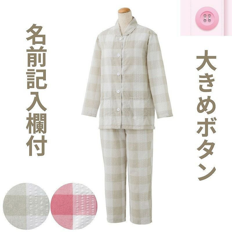 快適な日常生活をお過ごしいただけるためにお役立ていただける商品です着やすさとやさしい工夫のアイテムです肌離れの良いサッカー素材 暑い夏も涼しく快適で気持ちよく着られます。 ※柄は若干変更になる場合もございます。着脱カンタン!様々な工夫脱ぎ着しやすい工夫を凝らした優しい設計です。つかみやすい大きめボタンで手の力が弱くてもボタンの留め外しがラクラクです。一般のボタンに比べてつかみやすい大きめボタンを採用。この違いがご自身での着脱も簡単にしてくれます。名前記入欄付で間違い防止名前が書けるタグ付きなので、入院や施設入居時など、脱いだ後や洗濯後も他人のものと間違うことがありません。●品名/大きめボタンサッカープチサイズパジャマ(春夏用)●色/ピンク・ベージュ●サイズ/M・L・LL(P)●素材/ポリエステル65%・綿35%●生産国/中国製●仕様/洗濯機OK 名前記入欄付 大きめボタン●説明/肌離れの良いサッカー素材 サッカー ※柄は若干変更になる場合もございます。