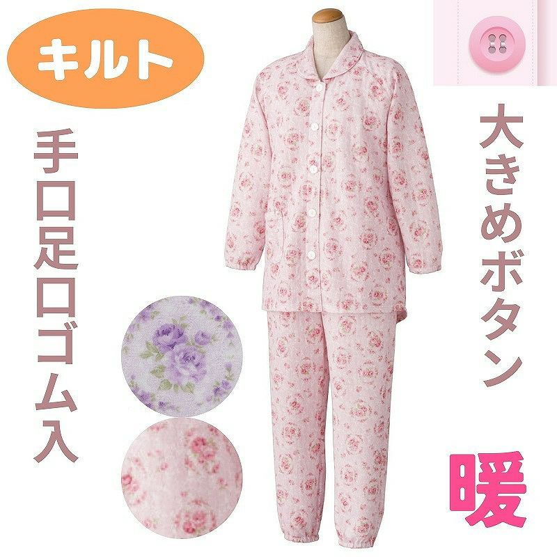 快適な日常生活をお過ごしいただけるためにお役立ていただける商品です着やすさとやさしい工夫のアイテムです暖かい空気を逃しにくい秋冬に最適な保温性のよいキルト素材。キルト素材は温かくなった空気を逃さず保温性抜群!ふんわり暖かなキルトパジャマです。着脱カンタン!様々な工夫脱ぎ着しやすい工夫を凝らした優しい設計です。つかみやすい大きめボタンで手の力が弱くてもボタンの留め外しがラクラクです。一般のボタンに比べてつかみやすい大きめボタンを採用。この違いがご自身での着脱も簡単にしてくれます。【手口・足口ゴム入り】手口と足口にゴム入りなので、めくれ上がりにくい設計です。後ろ身頃を長めにしているので、背中が曲がった方でも、背中が出にくい設計です。ウエスト調整ゴム付なのでゴムを入れ替えなくてもウエストサイズを自由自在に調整できます。【動きやすいラグラン袖】肩まわりがゆったりしているので、肩や腕が動かしやすく、脱ぎ着がしやすい仕様です。秋冬に最適な保温性のよいキルト素材キルト素材で温かくなった空気を逃さず保温性抜群●品名/婦人大きめボタンキルトパジャマ●色/ピンク・パープル●サイズ/S・M・L・LL●素材/ポリエステル80%・綿20%●生産国/中国製●仕様/洗濯機OK(ネット使用) 大きめボタン 後ろ身頃長め 動きやすいラグラン袖 手口・足口ゴム入り ウエスト調節ゴム付・S~4Lまで展開 キルト ※柄は若干変更になる場合もございます。●説明/暖かい空気を逃しにくい秋冬に最適な保温性のよいキルト素材。キルト素材は温かくなった空気を逃さず保温性抜群!ふんわり暖かなキルトパジャマです。