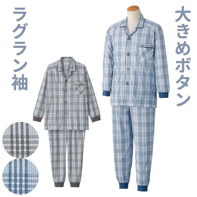 快適な日常生活をお過ごしいただけるためにお役立ていただける商品です着やすさとやさしい工夫のアイテムです肌触りの良いスムース素材のパジャマです。一年中快適に着られる綿混素材で優しい着心地。着脱カンタン!様々な工夫脱ぎ着しやすい工夫を凝らした優しい設計です。つかみやすい大きめボタンで手の力が弱くてもボタンの留め外しがラクラクです。一般のボタンに比べてつかみやすい大きめボタンを採用。この違いがご自身での着脱も簡単にしてくれます。【手口・足口ゴム入り】手口と足口にゴム入りなので、めくれ上がりにくい設計です。ウエスト調整ゴム付なのでゴムを入れ替えなくてもウエストサイズを自由自在に調整できます。【動きやすいラグラン袖】肩まわりがゆったりしているので、肩や腕が動かしやすく、脱ぎ着がしやすい仕様です。適宜、上記のような柄のなかから商品をお届けします。柄はお選びいただくことはできません。ご了承ください。後ろ身頃を長めにしているので、背中が曲がった方でも、背中が出にくい設計です。●品名/紳士大きめボタンパジャマ●色/ブルー・グレー●サイズ/S・M・L・LL●素材/ポリエステル80%・綿20%●生産国/中国製●仕様/洗濯機OK(ネット使用) 大きめボタン 動きやすいラグラン袖 手口・足口リブ付 ウエスト調節ゴム仕様 S~4L 前開き スムース ※柄は若干変更になる場合もございます。●説明/肌触りの良いスムース素材のパジャマです。一年中快適に着られる綿混素材で優しい着心地。