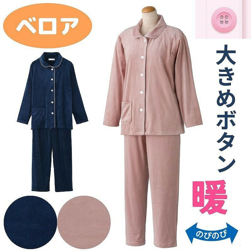 快適な日常生活をお過ごしいただけるためにお役立ていただける商品です着やすさとやさしい工夫のアイテムですのびのび素材を使用したパジャマで快適な着用感まるで毛布のようなロア素材で、なめらかさと暖かさで動きやすく寒い冬も快適やさしいパジャマ!様々な工夫【ストレッチパジャマ】親切設計!のびのび素材で着脱簡単。着脱がラクなだけでなく寝返もラクにできます。のびのび素材だから腕が通しやすい!●品名/婦人ストレッチベロアパジャマ●色/ピンク・ネイビー●サイズ/M・L●素材/ポリエステル95%・ポリウレタン5%●生産国/中国製●仕様/洗濯機OK(ネット使用) 大きめボタン のびのび ベロア ※柄は若干変更になる場合もございます。●説明/のびのび素材を使用したパジャマで快適な着用感まるで毛布のようなロア素材で、なめらかさと暖かさで動きやすく寒い冬も快適