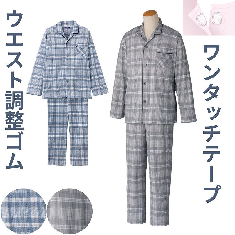 快適な日常生活をお過ごしいただけるためにお役立ていただける商品です着やすさとやさしい工夫のアイテムです年間を通して快適に着られるスムース素材のワンタッチパジャマ。ワンタッチテープ仕様で開け閉め簡単、前開きタイプで着脱もスムーズにできます♪ウエスト調節ゴム付きで体型に合わせてフィット。やわらかな着心地でゆったり休め、洗濯機OKで毎日清潔に使える便利なパジャマです。着脱カンタン!様々な工夫【ワンタッチテープ】ボタンが留めにくい方は前合わせのワンタッチテープ仕様で、着替えがスムーズにワンタッチ肌着で前が開くので着脱が楽です開け閉めがさっとできるから着替えがラクラク!着やすく脱ぎやすい親切設計!前開きなので一人でも簡単につけることができますマジックテープ商品に関するご注意洗濯時にはゴミのなどの付着の原因になりますのでテープを張り合わせてください。ウエスト調整ゴム付なのでゴムを入れ替えなくてもウエストサイズを自由自在に調整できます。●品名/ワンタッチパジャマ●色/ブルー・グレー●サイズ/S・M・L・LL●素材/ポリエステル80%・綿20%●生産国/中国製●仕様/洗濯機OK(ネット使用) ワンタッチテープ ウエスト調節ゴム付 前開き スムース ※柄は若干変更になる場合もございます。●説明/年間を通して快適に着られるスムース素材のワンタッチパジャマ。ワンタッチテープ仕様で開け閉め簡単、前開きタイプで着脱もスムーズにできます♪ウエスト調節ゴム付きで体型に合わせてフィット。やわらかな着心地でゆったり休め、洗濯機OKで毎日清潔に使える便利なパジャマです。