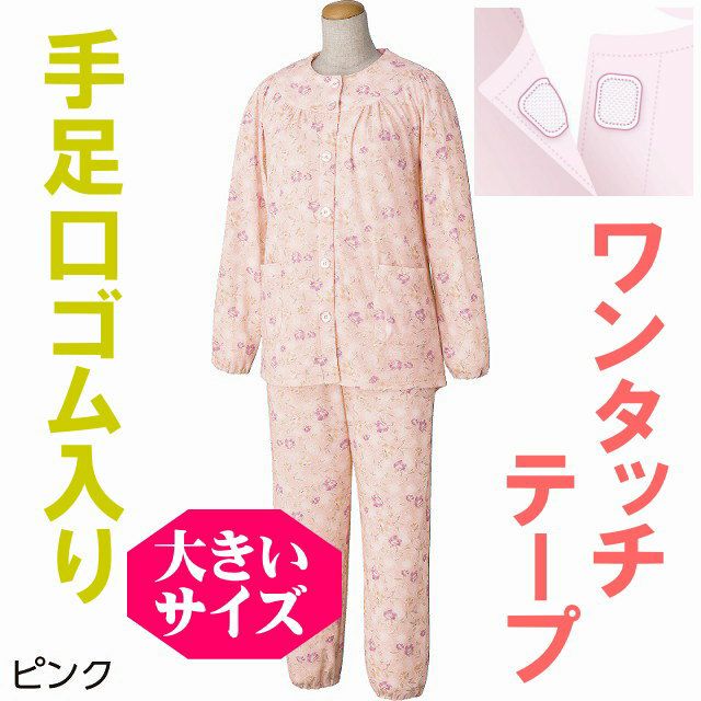 快適な日常生活をお過ごしいただけるためにお役立ていただける商品ですS~4Lまでサイズ豊富に展開。一年中快適に着られる綿混素材。※柄は若干変更になる場合もございます。 洗濯機OK 名前記入欄付 ワンタッチテープ 後ろ身頃長め 動きやすいラグラン袖 手口・足口ゴム入り、ウエスト調節ゴム付 手口・足口ゴム交換可能着脱カンタン!様々な工夫【ワンタッチテープ】着やすく脱ぎやすい親切設計!ボタンが留めにくい方は前合わせのワンタッチテープ仕様で、着替えがスムーズにワンタッチ肌着で前が開くので着脱が楽です【手口・足口ゴム入り】手口と足口にゴム入りなので、めくれ上がりにくい設計です。後ろ身頃を長めにしているので、背中が曲がった方でも、背中が出にくい設計です。ウエスト調整ゴム付なのでゴムを入れ替えなくてもウエストサイズを自由自在に調整できます。名前記入欄付で間違い防止名前が書けるタグ付きなので、入院や施設入居時など、脱いだ後や洗濯後も他人のものと間違うことがありません。●品名/【婦人ワンタッチパジャマ 年間 3L・4L】 cf97980 パジャマ ねまき●色/ピンク・サックス・パープル●サイズ/3L・4L●素材/ポリエステル65%・綿35%/スムース●生産国/中国製●仕様/S~4Lまでサイズ豊富に展開。一年中快適に着られる綿混素材。●説明/※柄は若干変更になる場合もございます。 洗濯機OK 名前記入欄付 ワンタッチテープ 後ろ身頃長め 動きやすいラグラン袖 手口・足口ゴム入り、ウエスト調節ゴム付 手口・足口ゴム交換可能 マジックテープ商品に関するご注意洗濯時にはゴミのなどの付着の原因になりますのでテープを張り合わせてください。