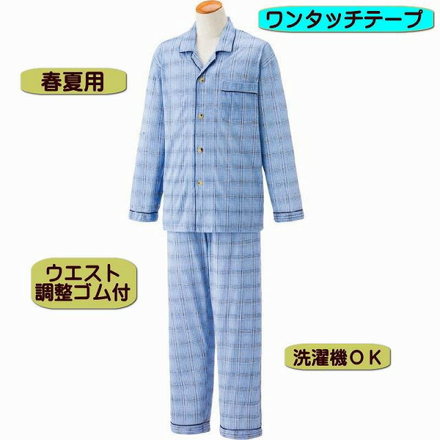 快適な日常生活をお過ごしいただけるためにお役立ていただける商品ですウエスト調節ゴム付薄くて横方向に伸縮性がある春夏素材。前合わせのワンタッチテープ式だから、着脱がスムーズに。※格子柄は若干変更になる場合もございます。●品名/ワンタッチテープ天竺パジャマ●色/ブルー・グレー●サイズ/S/M/L/LL●材質/ポリエステル65% 綿35% 天竺●追加説明/左胸ポケット付き●生産国/中国製●仕様/テープ説明 ワンタッチテープ ウエスト調節 洗濯機OK 春夏用●説明/ウエスト調節ゴム付薄くて横方向に伸縮性がある春夏素材。前合わせのワンタッチテープ式だから、着脱がスムーズに。