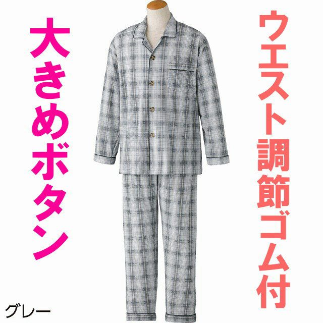 快適な日常生活をお過ごしいただけるためにお役立ていただける商品です【大きめボタンパジャマ】つかみやすい大きめボタンで手の力が弱くてもボタンの留め外しがラクラクです。一般のボタンに比べてつかみやすい大きめボタンを採用。この違いがご自身での着脱も簡単にしてくれます。薄くて横方向に伸縮性のある天竺ニットです。●品名/大きめボタン天竺パジャマ●色/グレー・ブルー●サイズ/S・M・L・LL●材質/ポリエステル65% 綿35% 天竺●生産国/中国製●仕様・説明/洗濯機OK●説明/春夏用