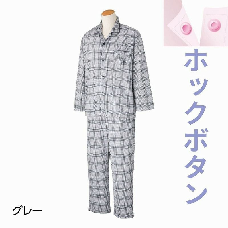 快適な日常生活をお過ごしいただけるためにお役立ていただける商品です着やすさとやさしい工夫のアイテムです一年中快適なスムース素材のパジャマ。心地よい肌触りのスムース素材一年中快適に着られる綿混素材。着脱カンタン!様々な工夫【ホックボタンパジャマ】脱ぎ着しやすい工夫を凝らした優しい設計です。ボタンが留めにくい方でも着替えに便利な前開きのホック留めです。●品名/紳士ホックパジャマ 年間用●色/ブルー・グレー●サイズ/S・M・L・LL●素材/ポリエステル80%・綿20%●生産国/中国製●仕様/スムース ※柄は若干変更になる場合もございます。 洗濯機OK ホック 年間●説明/一年中快適なスムース素材のパジャマ。心地よい肌触りのスムース素材一年中快適に着られる綿混素材。