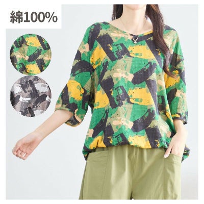 【婦人アートペイント柄Vネックコットンブラウス(裾ひも入り) L-LL】ds13260 綿100%のレビューを書く
